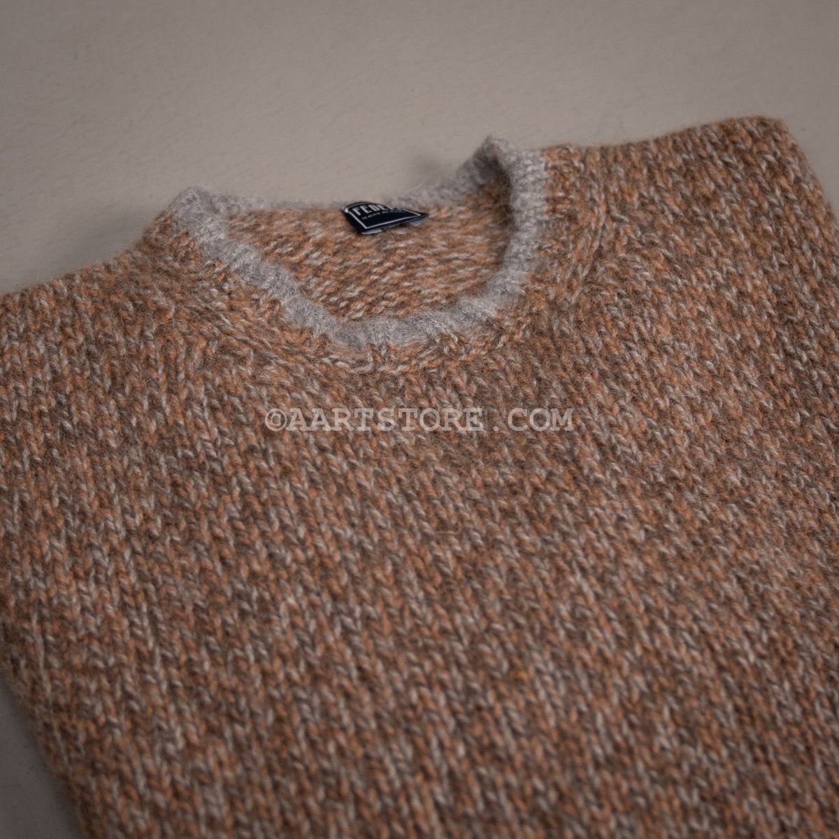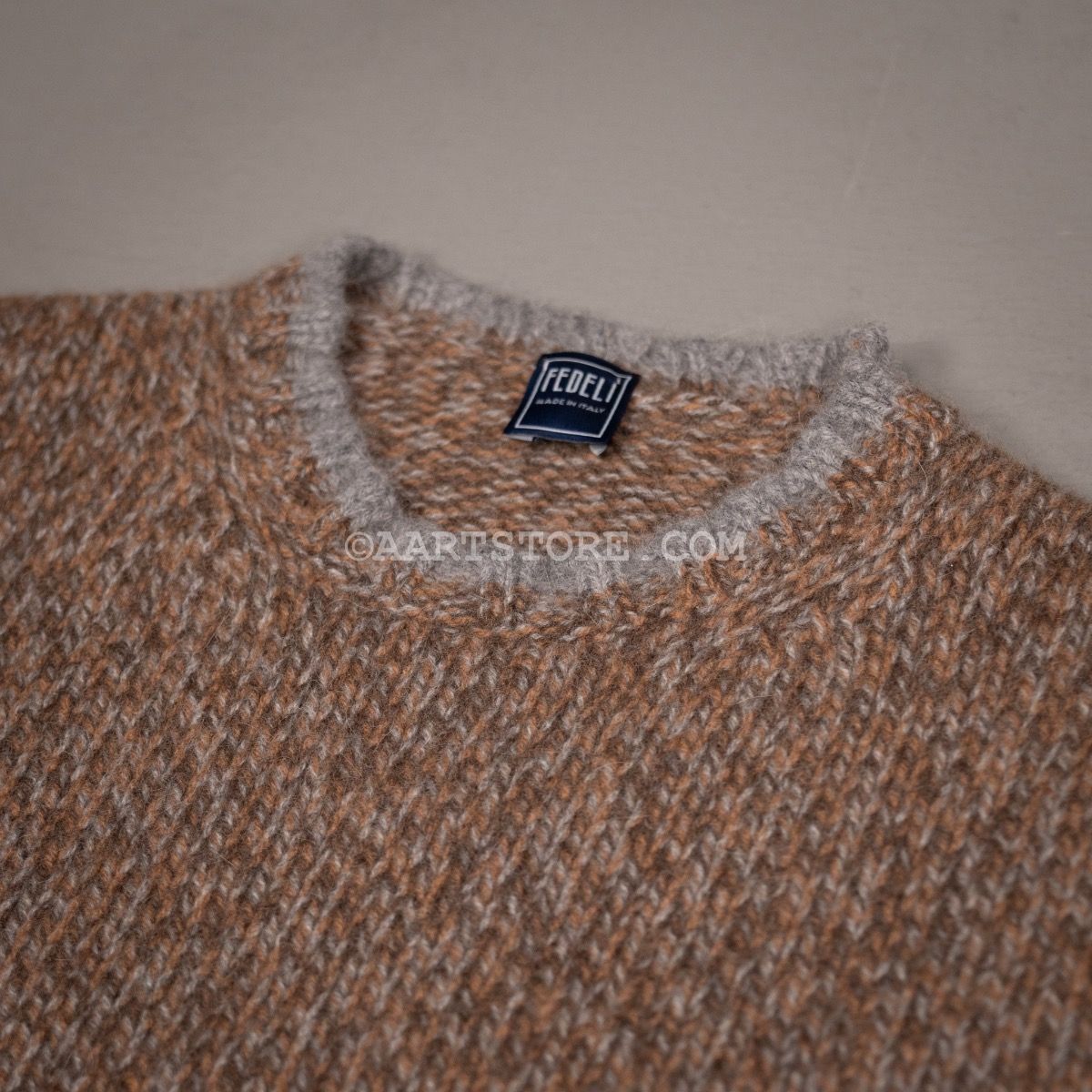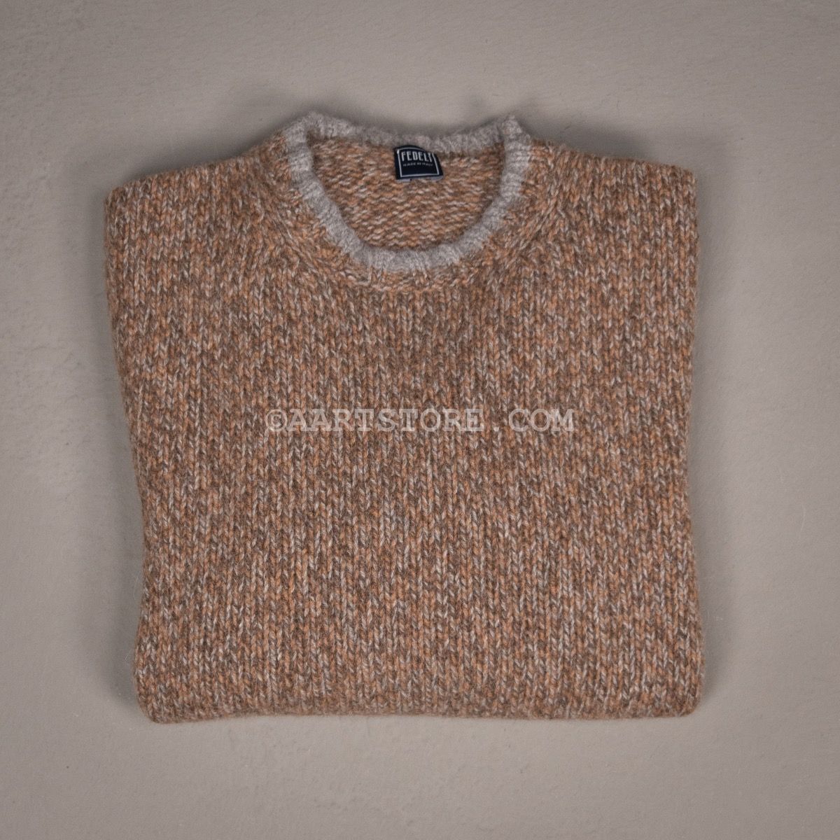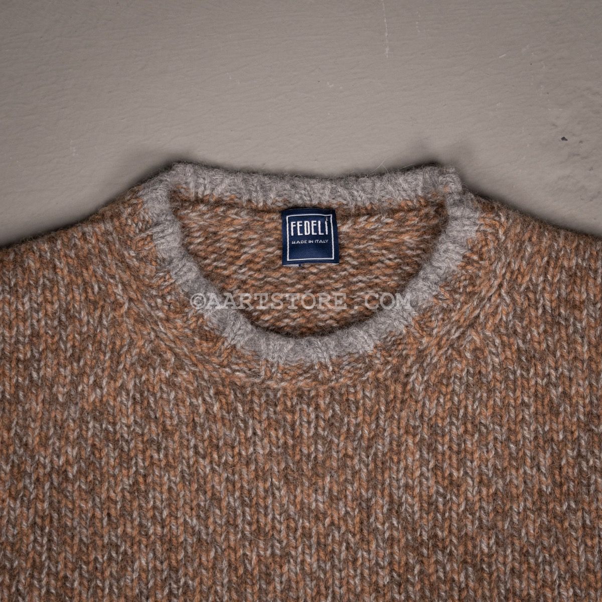 Fedeli staat bekend om hun sublieme breiwerk, het is een van de fijnste knitwear specialisten van Italië. Niet voor niet hebben zowel Zegna als Prada een belang genomen in dit bedrijf om zich te verzekeren van het vakmanschap van dit familiebedrijf. Deze trui is gemaakt van een mix van alpacca en scheerwol voor een lekker wollig en winters effect. Dit is een stoere trui die verassend veel luxer en zachter voelt dan je op basis van het uiterlijk zou verwachten. Door het gebruik van verschillend gekleurde draden is een gemarmerd effect ontstaan dat heel goed past bij denim en cord. Het subtiele randje langs de hals en bij de manchetten geeft de trui net dat tikje chique dat Fedeli onderscheidt van de rest.