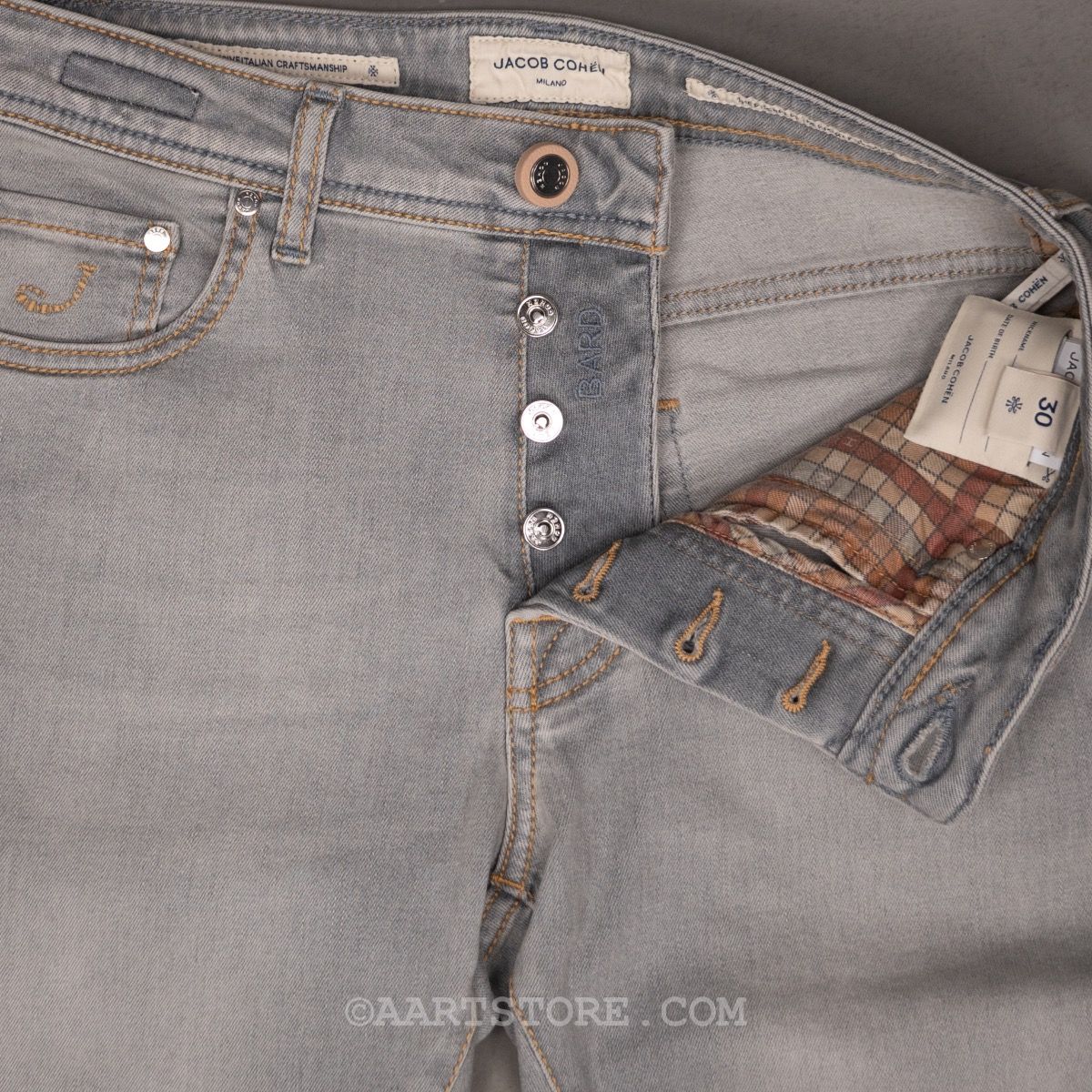 De Bard van Jacob Cohën is de fitted jeans van dit Iconische, Italiaanse denim label. Een iets hogere waist in combinatie met comfort op het bovenbeen en een smalle voetwijdte maakt dit een eigentijdse broek voor de man die van comfort houdt. Zoals altijd bij Cohën is het een jeans die de traditionele spijkerbroek ver overstijgt. Deze Flavio is een van onze favorieten uit de FW25 collectie. De combinatie van lichtgrijze denim met de beige stitch, het prachtig uitgewerkte label en de zandbeige naspoeling die de broek ondergaan heeft, maakt dit een uniek stuk. Dit is een denim die perfect past bij een relaxt luxe outfit met cashmere in natureltinten en een eventueel jasje.