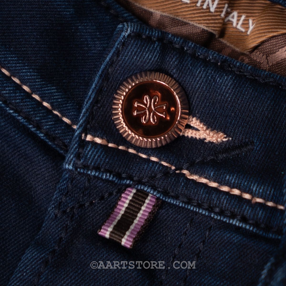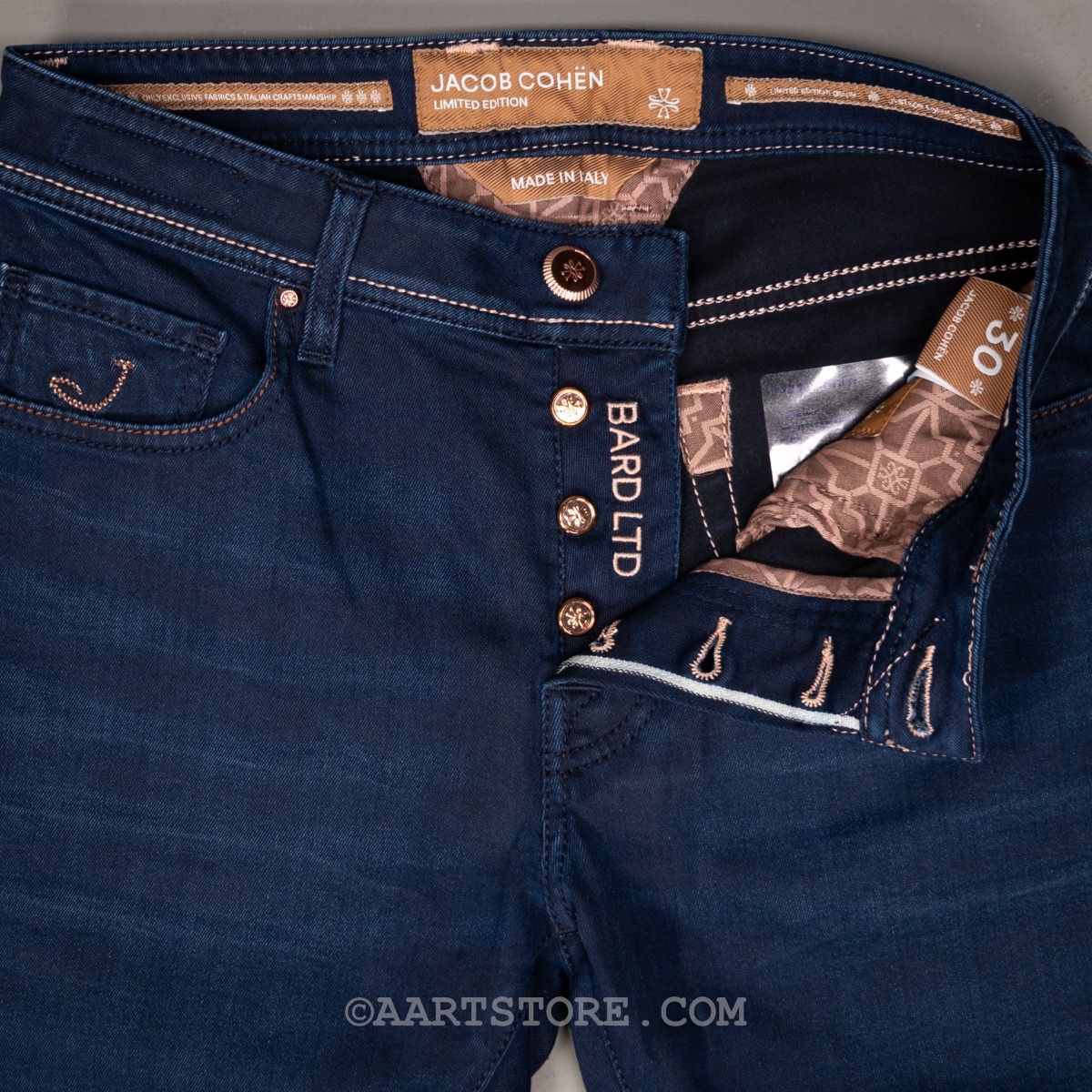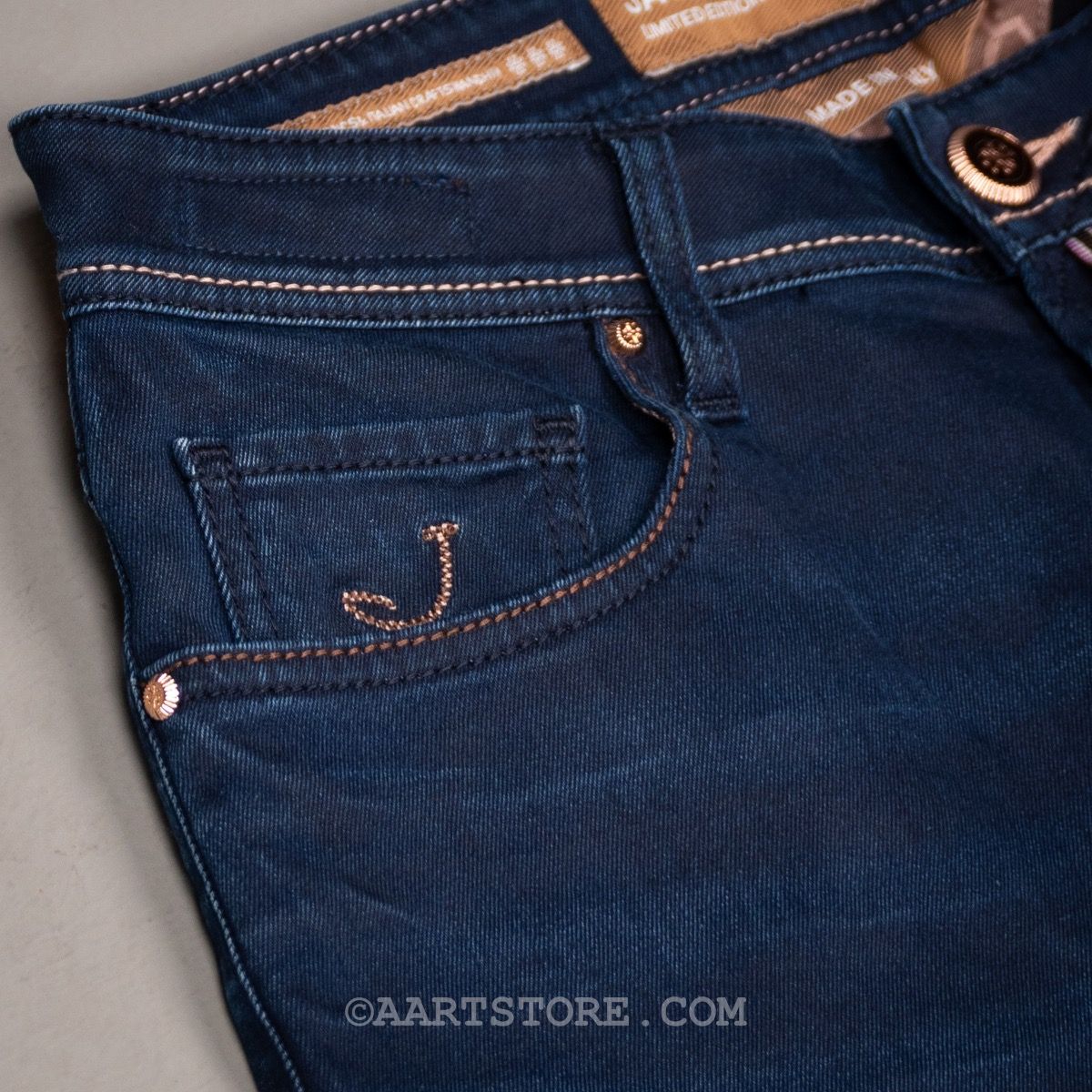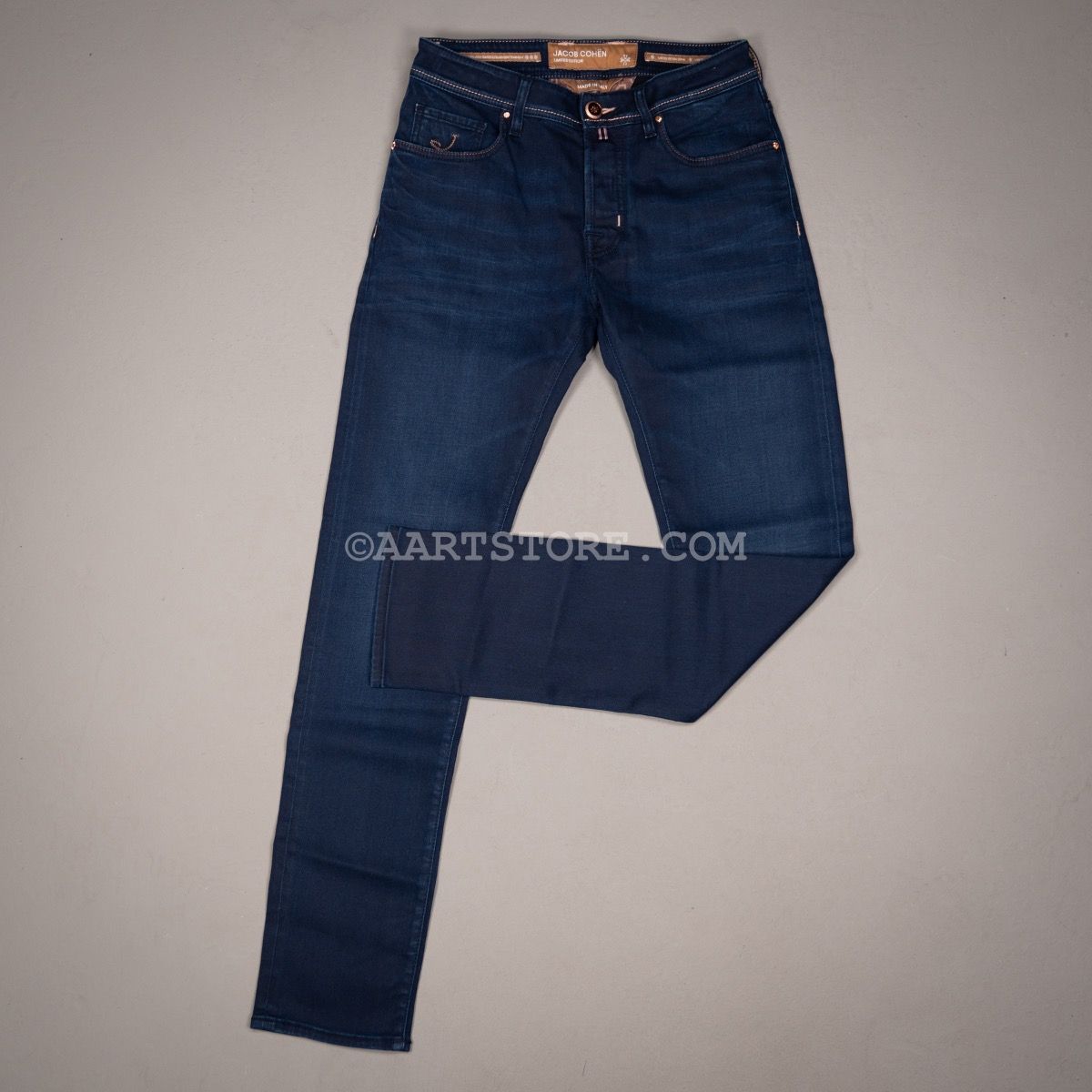 De Bard (voorheen 688) van Jacob Cohën is de fitted jeans van dit Iconische, Italiaanse denim label. Een iets hogere waist in combinatie met comfort op het bovenbeen en een smalle voetwijdte maakt dit een eigentijdse broek voor de man die van comfort houdt. Zoals altijd bij Cohën is het een jeans die de traditionele spijkerbroek ver overstijgt. Dit exemplaar is een Limited Edition, genummerd en gesneden uit een selvedge denim. Voor de man die het allerbeste wil. De perfecto is een prachtige donkere broek. Het blauw is net anders, met een beetje aqua en zwart in de kleur, smaakvol gecombineerd met rosé goud. Deze denim is perfect bij een jasje maar ook gewoon bij een polo.