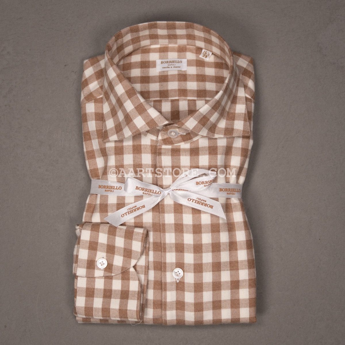 Borriello is een vakkundige shirtmaker uit Napels. De fijne stitching, de parelmoeren knopen en natuurlijk de pasvorm maken het een heerlijk shirt. De combinatie van een traditionele, hand gestikte maakwijze met rijke stoffen maken het een bijzonder shirt en een perfecte manier om kennis te maken met de shirts volgens de Napolitaanse school. Dit shirt is gesneden uit een een luxe kwaliteit van katoen met cashmere met een grotere gingham ruit. Dit maakt het shirt meerv casual dan zakelijk, maar het past goed onder een donkerblauw jasje. Het boord verdient een bijzondere vermelding: de Capri. Ons eigen ontwerp, samen met Borriello ontwikkeld. Het is een kruising tussen een one piece en een normaal boord, waardoor het prachtig valt als het open gedragen wordt.