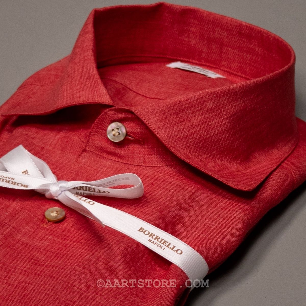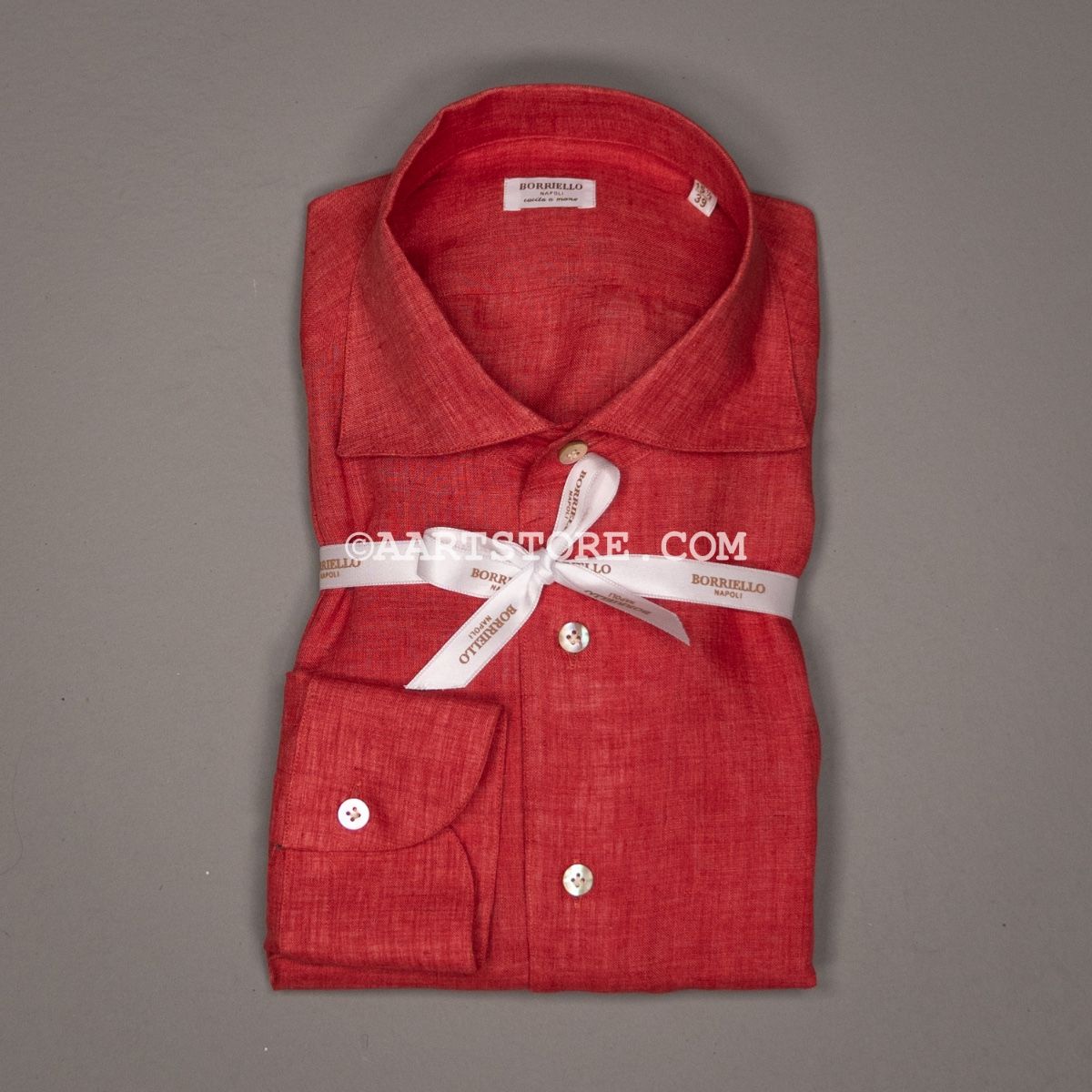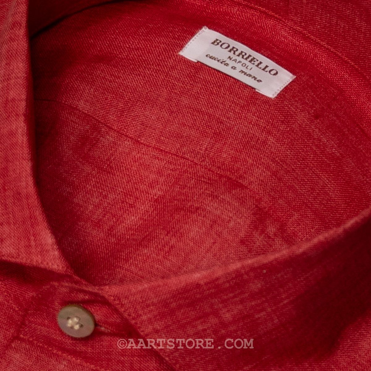 Borriello is een vakkundige shirtmaker uit Napels. De fijne stitching, de parelmoeren knopen en natuurlijk de pasvorm maken het een heerlijk shirt. De combinatie van een traditionele, hand gestikte maakwijze met rijke stoffen maken het een bijzonder shirt en een perfecte manier om kennis te maken met de shirts volgens de Napolitaanse school. Dit shirt is gesneden uit zacht, Italiaans linnen. Dit materiaal wordt eerst geverfd en dan meteen gewassen, zo ontstaat het watercolour effect. Dit maakt het shirt geschikt voor zowel zakelijk als casual gebruik. Het boord verdient een bijzondere vermelding: de Capri. Ons eigen ontwerp, samen met Borriello ontwikkeld. Het is een kruising tussen een one piece en een normaal boord, waardoor het prachtig valt als het open gedragen wordt, maar nog steeds goed te combineren is met een jasje.