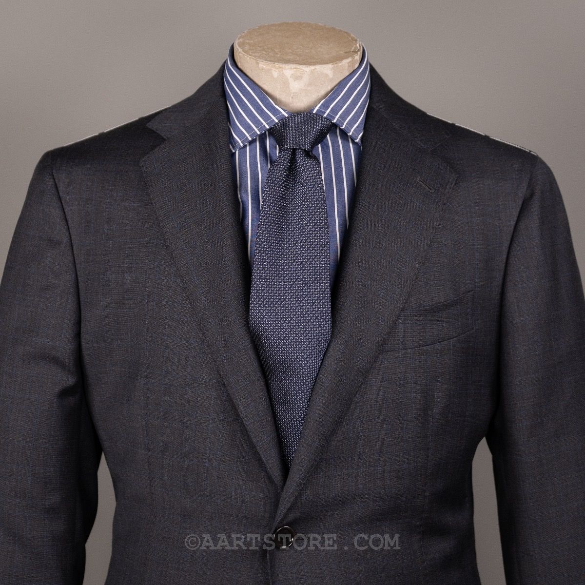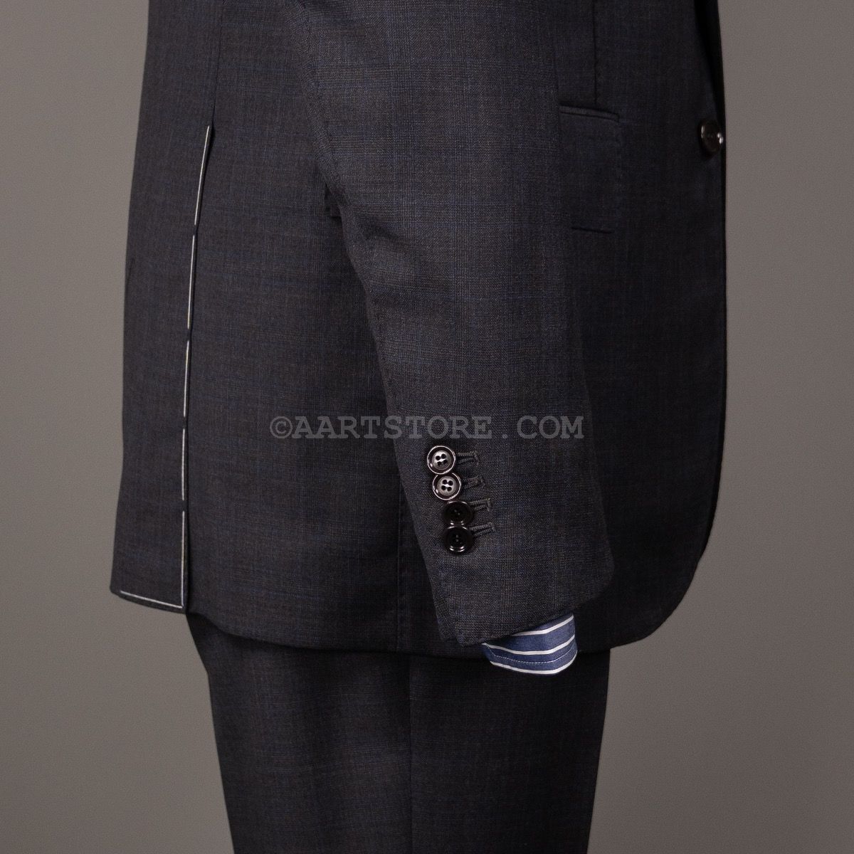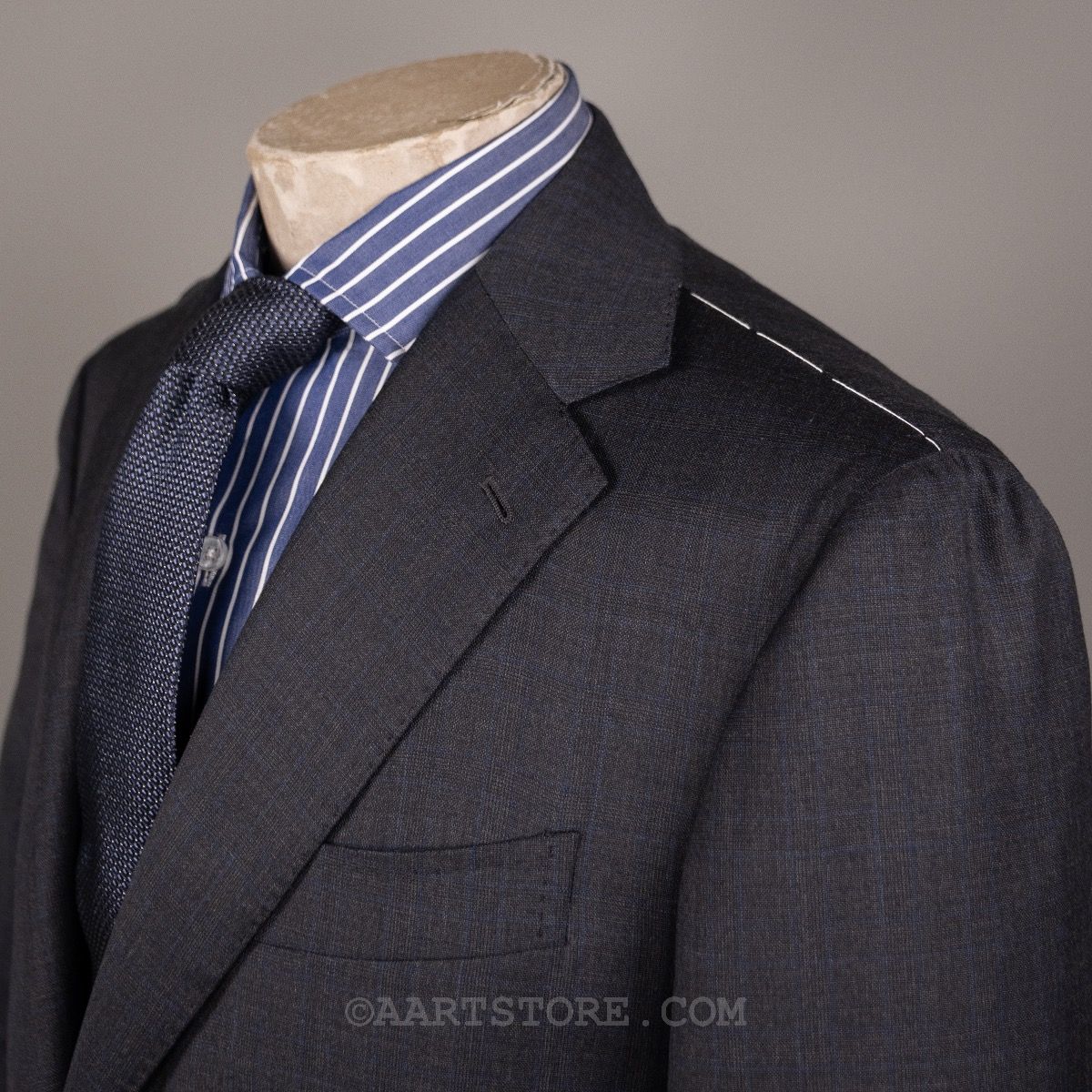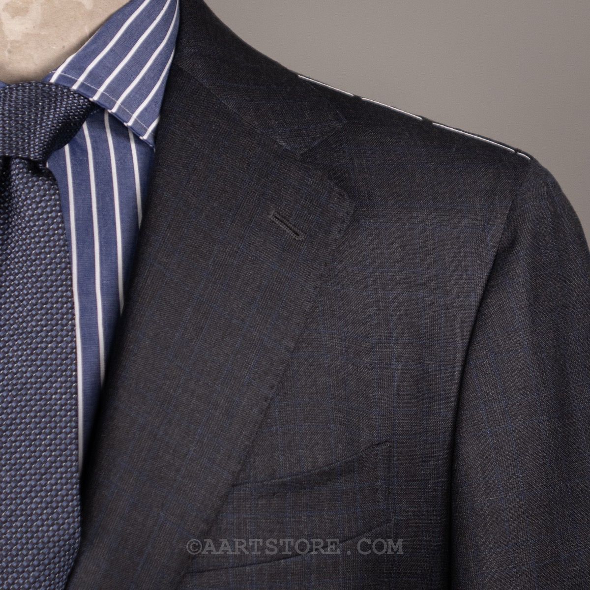 Stile Latino is het label van Vincenzo Attolini en zijn zoon Cesare. Deze telgen van deze beroemde kleermakersfamilie zijn hun label 15 jaar geleden begonnen met maar 1 idee: de allerbeste Napolitaanse tailoring combineren met een eigentijdse, sexy fit. Dat zie je duidelijk terug in dit pak met vage glenncheck. Wat bij de meeste pakkenmakers een uitzondering is, mag je bij Stile Latino als vanzelfsprekend beschouwen: de stof is een super 140 die zelfs nog rijker voelt en in een heel elegante grijstint. De pasvorm is aan het lichaam, maar zonder belemmering en het is een pak dat je iedere dag kunt dragen zonder dat het alledaags is. Kijk ook nog even naar alle details en je bent verkocht. Dit is simpelweg een van de mooiste en mooist gemaakte pakken die je kunt bezitten.