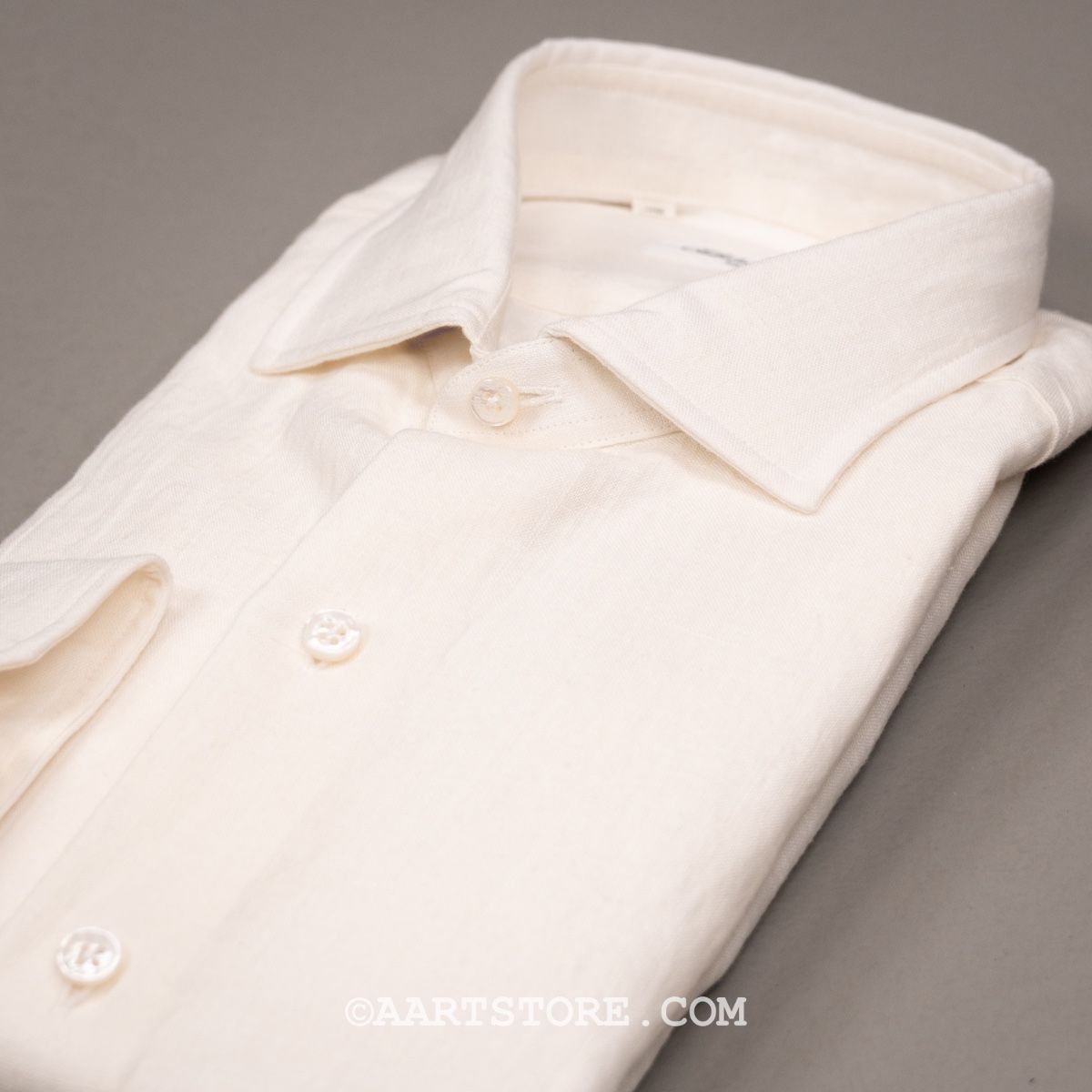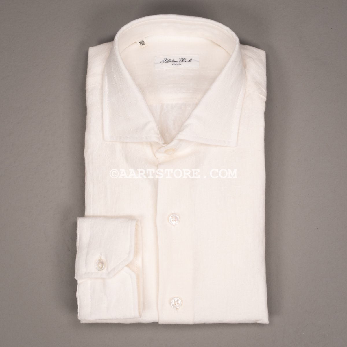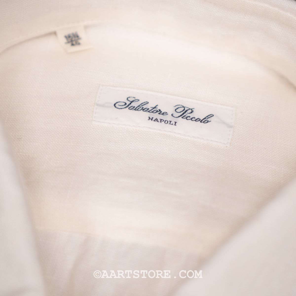 Salvatore Piccolo is een Napolitaanse shirtkunstenaar. Hij maakt een uniek en bijzonder rijk shirt dat zich onderscheidt van de massa. Het zijn handgemaakte hemden gesneden uit niet alledaagse stoffen die vaak speciaal voor Salvatore geweven worden. Dit shirt zit vol met details, maar mijn favoriet is wel de extra coupnaad in de mouw waardoor deze de natuurlijke kromming van de arm beter volgt. De linnen die Slvatore gebruikt voor dit shirt komt uit Japan en is opvallend stevig en compact geweven. Hierbij blijft de luchtige nonchalance van linnen wel behouden, maar het geeft het shirt wel body. Hierdoor heeft dit Piccolo shirt iets stevigs dat heel goed past bij afgewassen zomerdenims en sneakers.