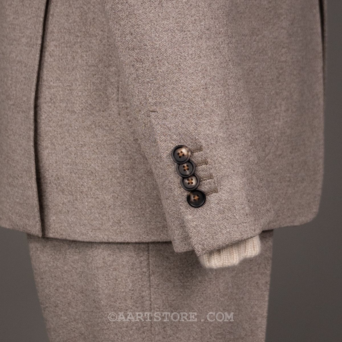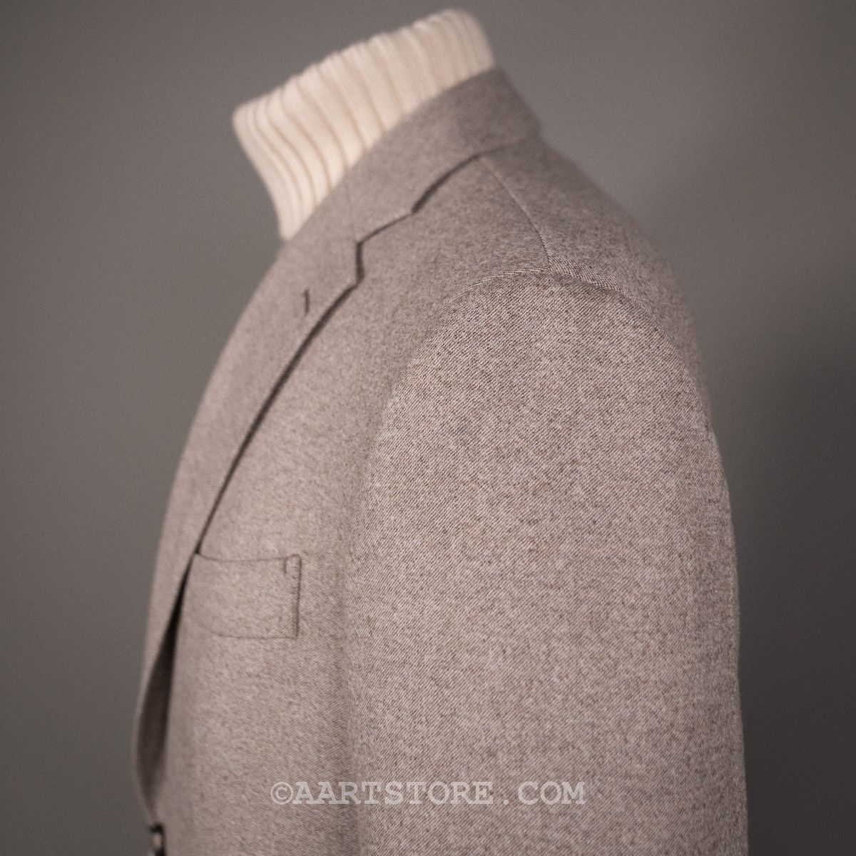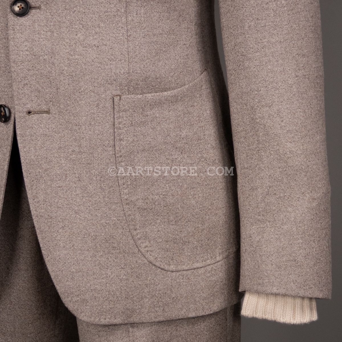 Dit nieuwe AART pak is een stevige evolutie van ons eerdere werk. Gemaakt met een super lichte maar wel full canvas constructie zweeft het jasje om je heen. Daar past het iets bredere revers en de napolitaanse schouder perfect bij.Net iets meer casual dan standaard is het prima te dragen als formeel pak, maar ook mooi met een trui of zelfs als los jasje. De broek heeft de uitstraling van een chino, met een in stof gemaakte binnenband en doorgestikte zoom. Door de pasvorm met één bandplooi is de broek moderner en iets losser, zonder dat het een Volendammer wordt. Elegant is hier het sleutelwoord. Gemaakt van Drago (een Italiaanse top-wever) flanel die door stretch iets meer comfort biedt dan je zou verwachten. En dan tot slot de kleur, die kan ik proberen te omschrijven maar die moet je gewoon ervaren en aanzien…