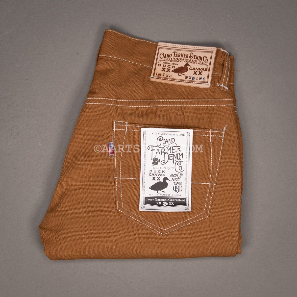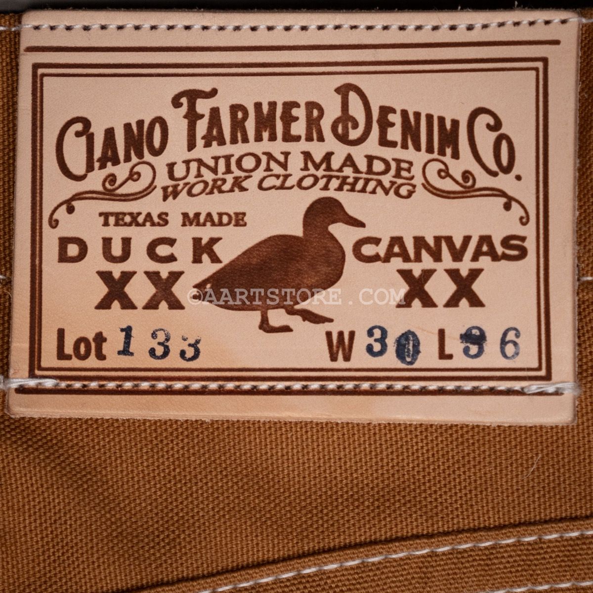 Onze vriend Ciano Farmer maakt jeans zoals 100 jaar gelden in zijn kleine werkplaats in Denton, Texas, USA. Alles aan zijn jeans is handgemaakt met materialen en accessoires die 100% gemaakt zijn in de VS. Hij gebruikt doeken die niet meer gemaakt worden, deadstock rollen 'echte' denim die soms wel 60 jaar oud zijn. De knopen en rivets zijn ook afkomstig van oude voorraden, verzameld uit verlaten fabrieken. Daarmee zijn dit de laatste 100% Amerikaanse jeans, een unieke kans om een stuk draagbare geschiedenis te bezitten. Deze broek is gemaakt van Duck Canvas, een stevige stof met een andere (1x1) weving dan denim. Een heel stevige stof die ook gebruikt wordt voor werkkleding.