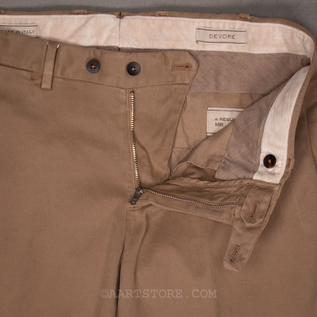 Devore is een Napolitaanse broekenspecialist. Jarenlang maakte dit familiebedrijf vooral broeken voor andere partijen en hierdoor staan ze in de business bekend als een uiterst vakkundige en betrouwbare partner. Sinds een paar jaar maakt Devore hun eigen collectie; bijzonder mooi gemaakte broeken voor een alleszins redelijke prijs. De constructie is prachtig gemaakt van verschillende materialen waardoor een speels effect ontstaat. De broekband is een uitvinding van Devore, de Flexowaist geeft extra comfort bij bewegen en zitten zonder dat de broek afzakt. Het model is eigentijds, met iets meer ruimte en een pasvorm die toeloopt naar de voet. Deze Fall twill chino is een nieuwe stof die heel zacht en rijk voelt. Gemaakt van katoen, Lyocel (Eucalyptustak) en stretch biedt dit materiaal comfort en bewegingsvrijheid. Deze chino is clean genoeg om hem te dragen bij een jasje, maar uiteraard ook bij een trui of andere knitwear. (NB. de lengte van de Devore broeken is aangepast, ze zijn iets langer dan voorheen waarbij de grotere maten meer langer zijn geworden. Nu vergelijkbaar met o.a. Jacob Cohën).