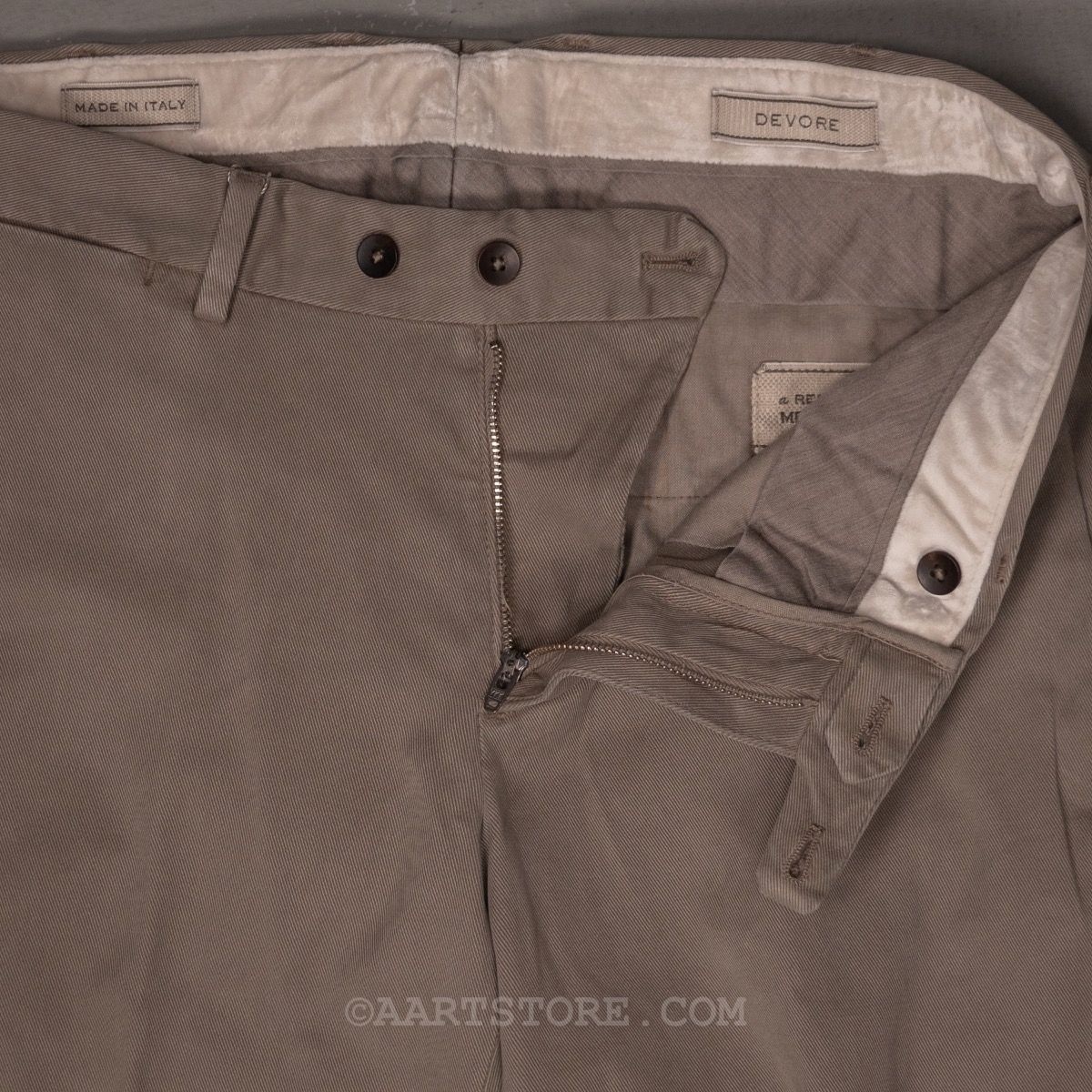 Devore is een Napolitaanse broekenspecialist. Jarenlang maakte dit familiebedrijf vooral broeken voor andere partijen en hierdoor staan ze in de business bekend als een uiterst vakkundige en betrouwbare partner. Sinds een paar jaar maakt Devore hun eigen collectie; bijzonder mooi gemaakte broeken voor een alleszins redelijke prijs. De constructie is prachtig gemaakt van verschillende materialen waardoor een speels effect ontstaat. De broekband is een uitvinding van Devore, de Flexowaist geeft extra comfort bij bewegen en zitten zonder dat de broek afzakt. Het model is eigentijds, met iets meer ruimte en een pasvorm die toeloopt naar de voet. Deze Fall twill chino is een nieuwe stof die heel zacht en rijk voelt. Gemaakt van katoen, Lyocel (Eucalyptustak) en stretch biedt dit materiaal comfort en bewegingsvrijheid. Deze chino is clean genoeg om hem te dragen bij een jasje, maar uiteraard ook bij een trui of andere knitwear. (NB. de lengte van de Devore broeken is aangepast, ze zijn iets langer dan voorheen waarbij de grotere maten meer langer zijn geworden. Nu vergelijkbaar met o.a. Jacob Cohën).
