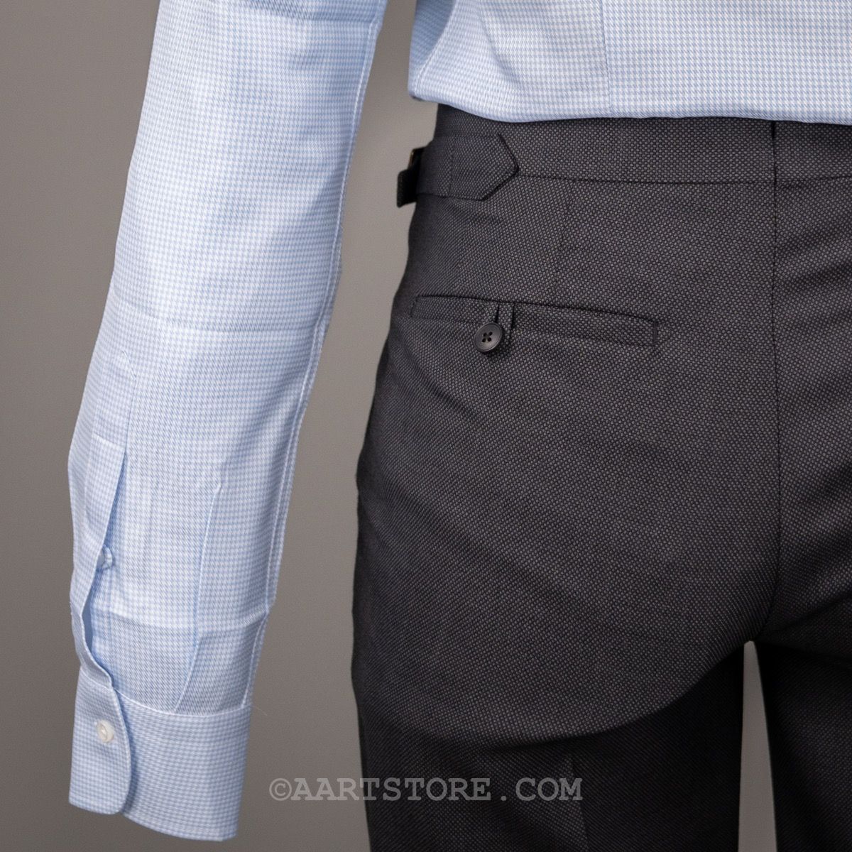 Het Birdseye pak van AART is een pak met een klassieke birdseye, een Britse klassieker in Italiaanse uitvoering. Het is een all year materiaal met subtiel patroon, sportief maar daarmee heel elegant. Het pak heeft dunne, Napolitaanse schouders met een gestructureerde borstpartij. Het pak is slank gesneden, met een full canvas constructie, zoals het een Italiaans kleermakerspak betaamd.
