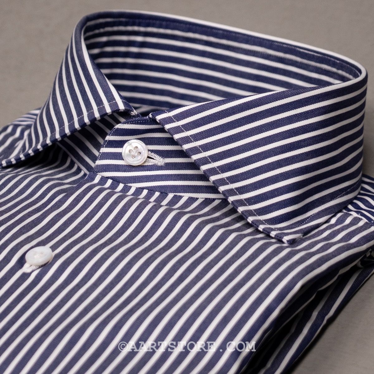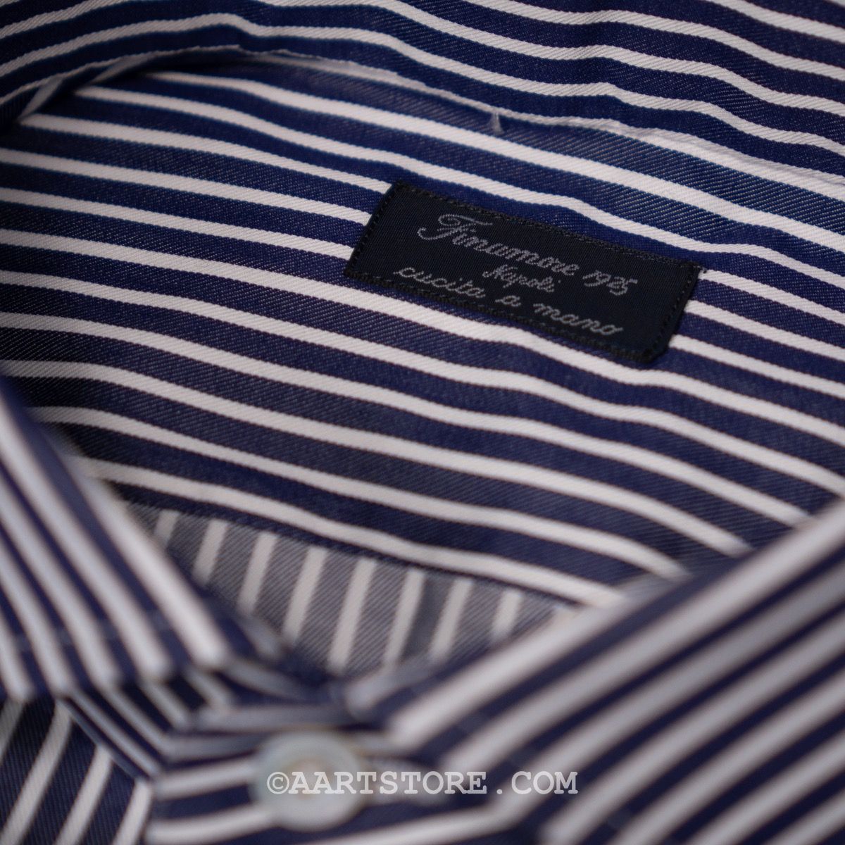 De shirts van Finamore behoren tot de wereldwijde top. Met veel handgemaakte details is dit het perfecte Napolitaanse shirt. De kraag is met een handsteek vastgezet, de mouwen hebben typisch Italiaanse plooitjes. De pasvorm is aan het lichaam gesneden maar wel met voldoende comfort met een genereuze lichaams- en mouwlengte. Dit shirt is gesneden uit een doppio ritorto doek met een reverse effect brede streep, perfect bij een pak of blazer pak. Maar ook mooi op een jeans met een navy trui. Een kleine waarschuwing: het dragen van Finamore shirts kan verslavend werken…