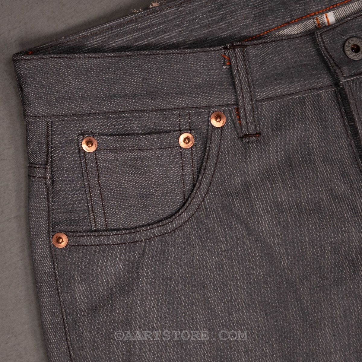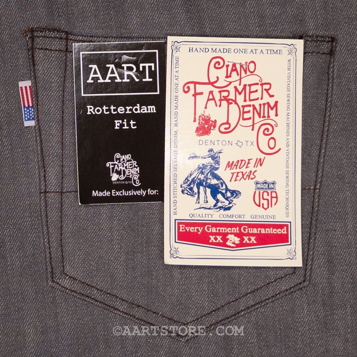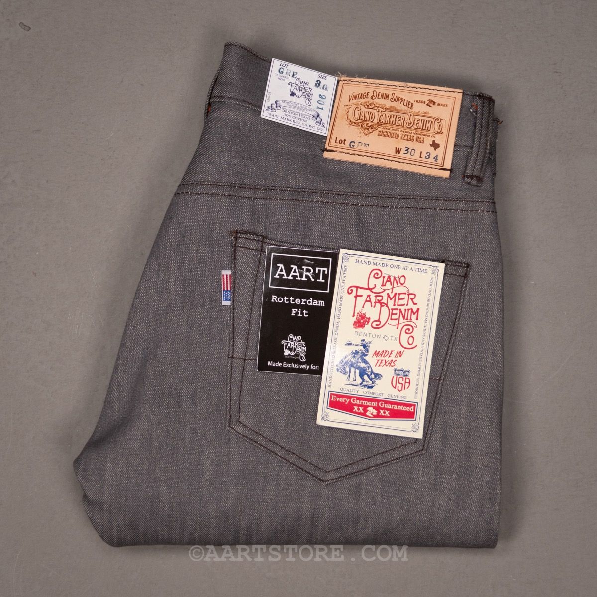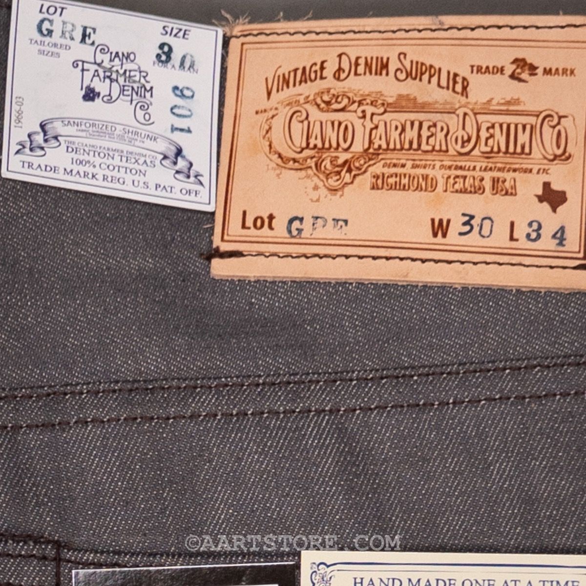 Onze vriend Ciano Farmer maakt jeans zoals 100 jaar gelden in zijn kleine werkplaats in Denton, Texas, USA. Alles aan zijn jeans is handgemaakt met materialen en accessoires die 100% gemaakt zijn in de VS. Hij gebruikt doeken die niet meer gemaakt worden, deadstock rollen echte denim die soms wel 60 jaar oud zijn. De knopen en rivets zijn ook afkomstig van oude voorraden, verzameld uit verlaten fabrieken. Daarmee zijn dit de laatste 100% Amerikaanse jeans, een unieke kans om een stuk draagbare geschiedenis te bezitten. De denim van deze broek is gemaakt van een oorspronkelijke grijze denim, dus niet een afgewassen zwart maar een denim die grijs gewoven is, een stof die ook niet meer gemaakt wordt. Dit is een broek die alleen maar mooier wordt, bij elke keer dragen en wassen.