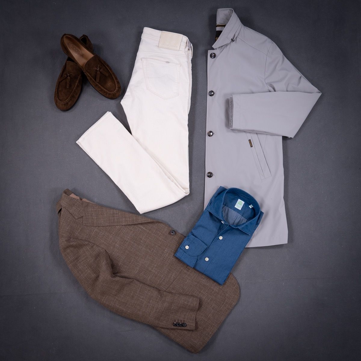 Nu is niets normaal, maar er gloort hoop! En als we dan weer op pad mogen, dan wil je ook goed gekleed gaan. Mijn verwachting is dat de vercasualisering van business door zal zetten, ook als de kantoren weer vol lopen. Dus -zeker in de zomer- vergeet het pak en investeer in een jasje. Dit jersey ETRO jasje zit als een sweater, maar geeft je chique aan je casual. Hier met een Cohën 613 in ongeverfde denim en met een stretch regenjas van Moorer. De finishing touch is het geklede jeans shirt en natuurlijk de loafers. Mooi als de som zoveel meer is dan de componenten!