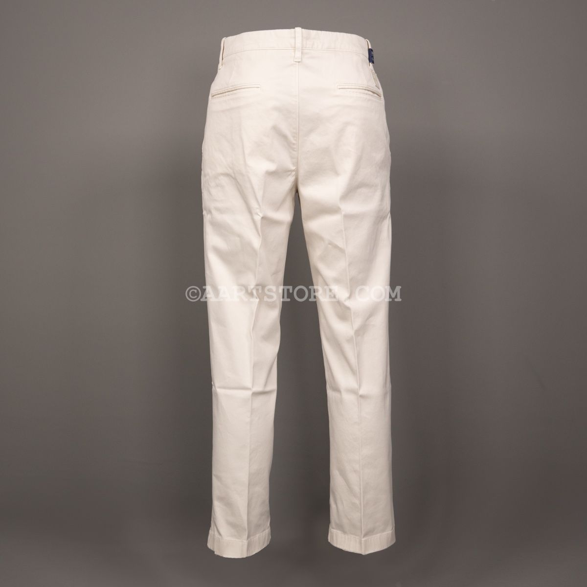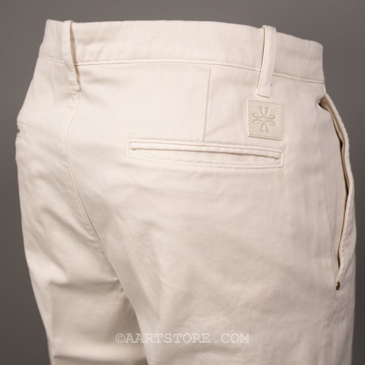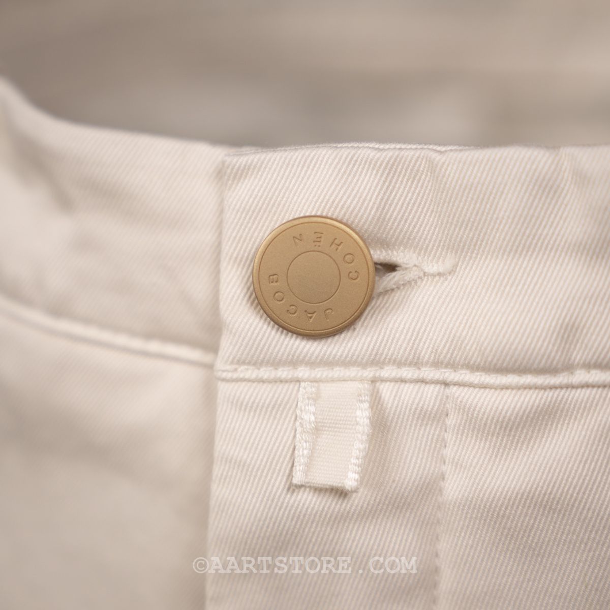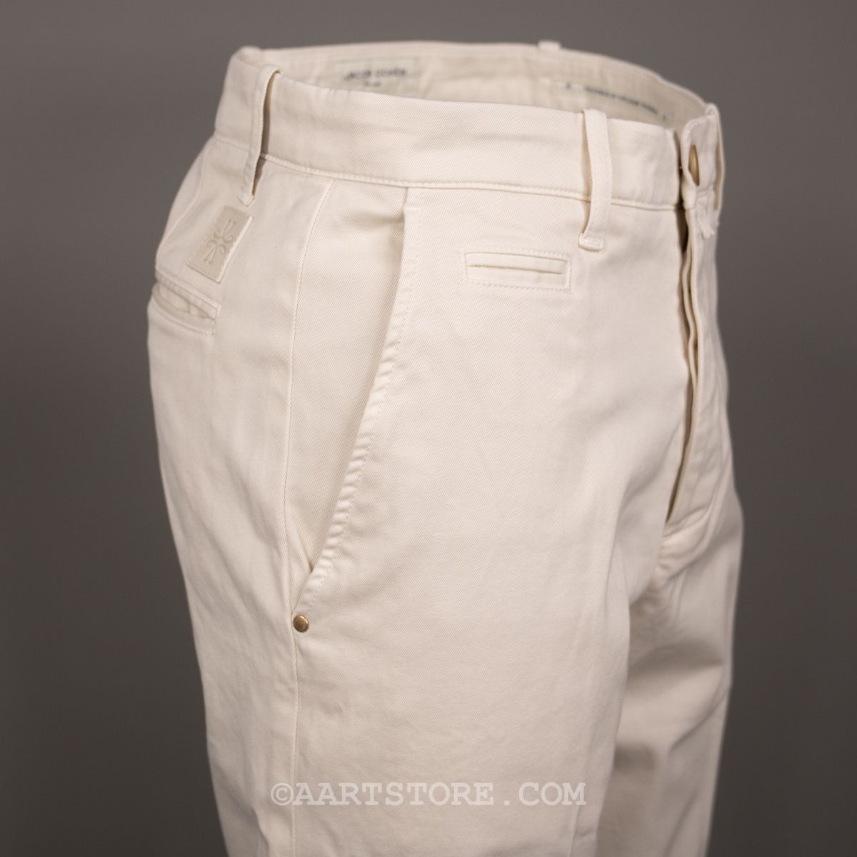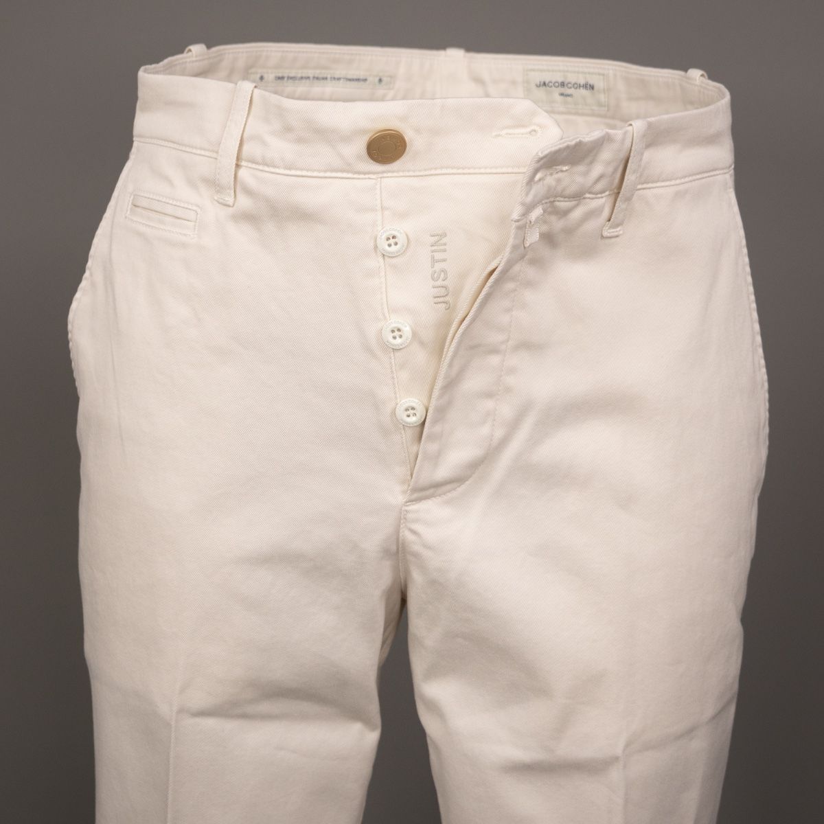 Jacob Cohën biedt sinds een jaar een nieuw model chino: de Justin. Dit model heeft een duidelijk ander silhouet. De broek is wijder op het bovenbeen met een lichte carrot vorm, dus toelopend naar onder. De Justin heeft een aanzienlijk kortere lengte en het is de bedoeling dat de chino boven de schoen gedragen wordt. De lijfhoogte is achter iets hoger voor een relaxt draagcomfort. Deze broek heeft een knoopgulp, zoals dat hoort bij een militair geïnspireerde broek, net een beetje stoerder. Het materiaal is stevig maar toch zacht en met stretch, zodat uitstraling en comfort samen komen. De Justin is perfect voor een echt zomerse outfit. Draag deze Cohën met een bootschoen en een polo en je bent klaar voor zonnige dagen en zwoele avonden.