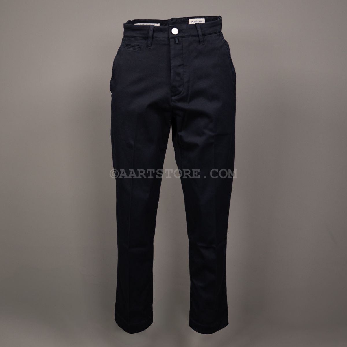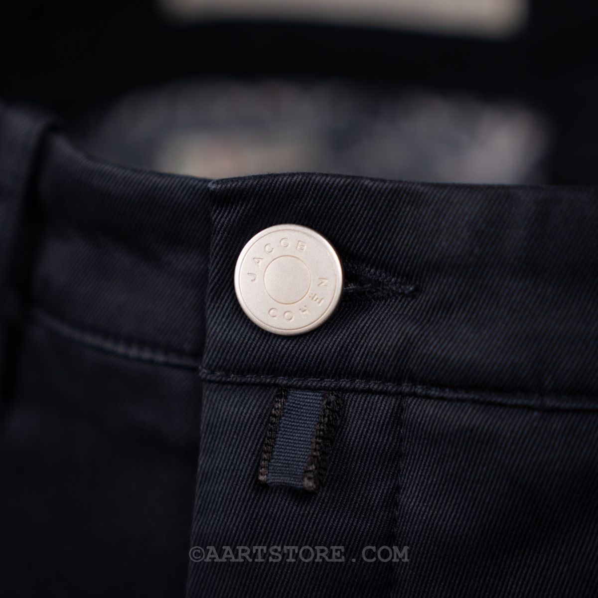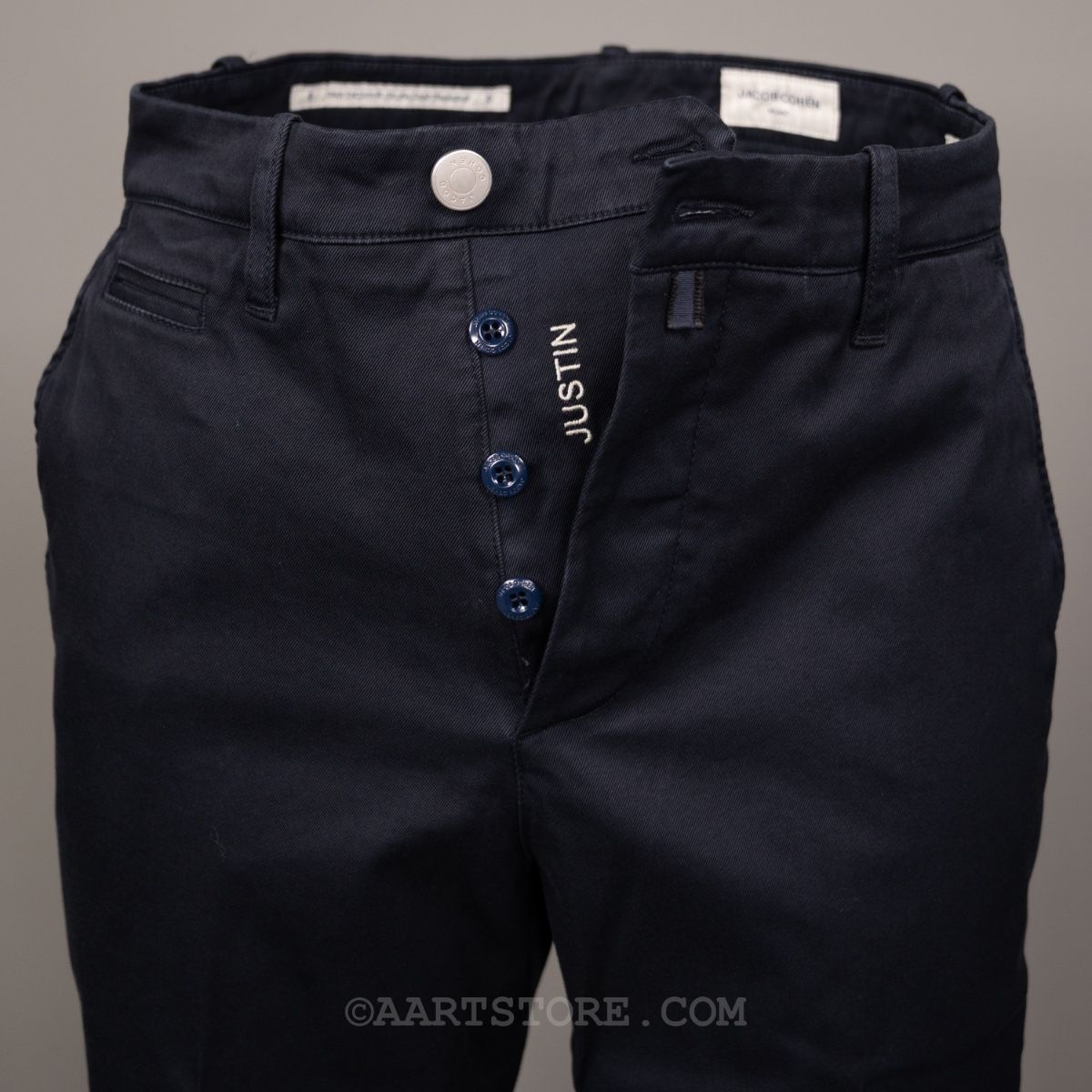 Jacob Cohën biedt sinds een jaar een nieuw model chino: de Justin. Dit model heeft een duidelijk ander silhouet. De broek is wijder op het bovenbeen met een lichte carrot vorm, dus toelopend naar onder. De Justin heeft een aanzienlijk kortere lengte en het is de bedoeling dat de chino boven de schoen gedragen wordt. De lijfhoogte is achter iets hoger voor een relaxt draagcomfort. Deze broek heeft een knoopgulp, zoals dat hoort bij een militair geïnspireerde broek, net een beetje stoerder. Het materiaal is stevig maar toch zacht en met stretch, zodat uitstraling en comfort samen komen. De Justin is perfect voor een echt zomerse outfit. Draag deze Cohën met een bootschoen en een polo en je bent klaar voor zonnige dagen en zwoele avonden.