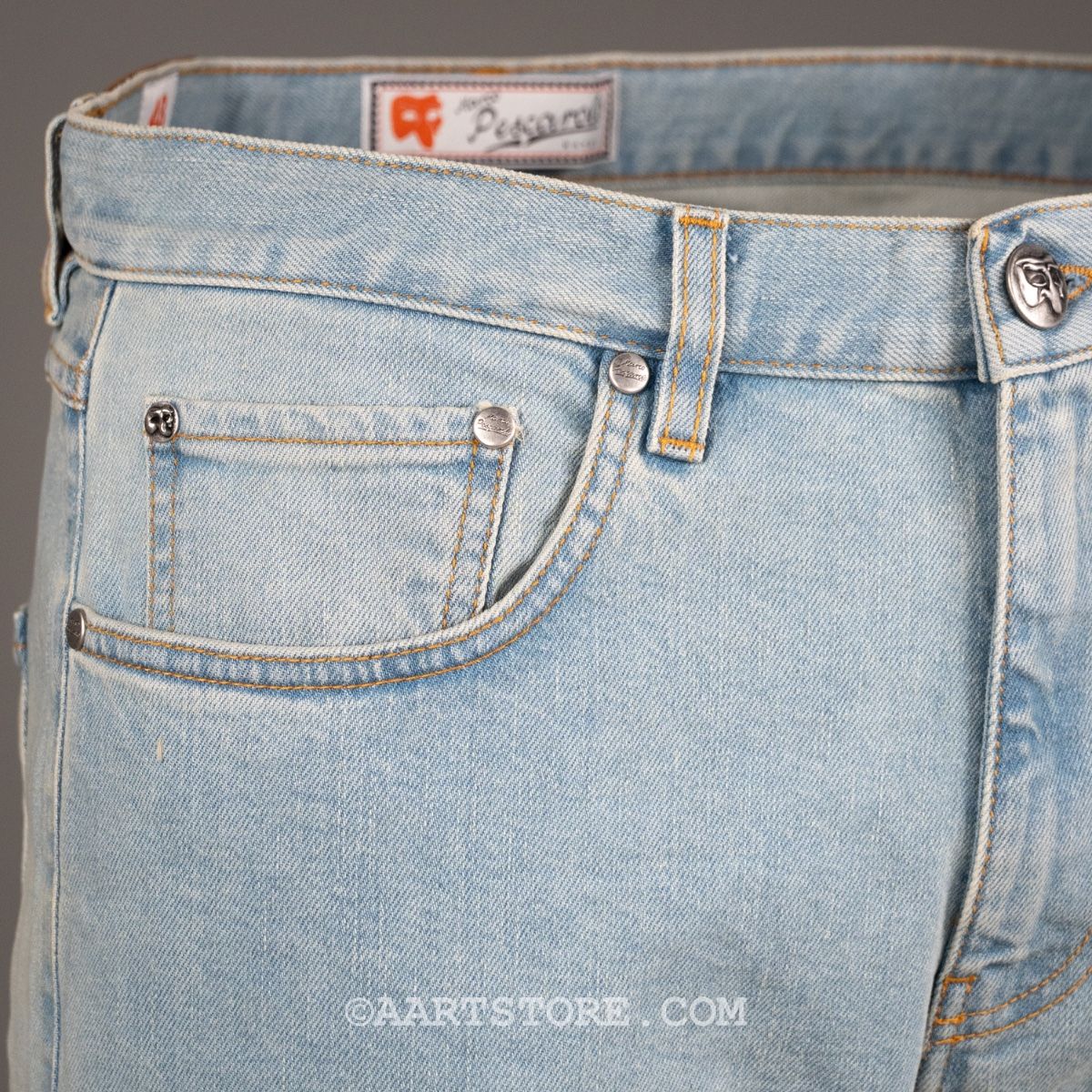 Pescarolo is een Napolitaanse broekenmaker die luxe combineert met een geheel eigen visie op hoe een broek moet zitten en vallen. Een prachtig bedrijf van twee (jonge) mannen die in staat zijn kunsten en stijlen van voorbije generaties te vertalen naar het nu. Steeds vaker experimenteren Mario en Maurizio en zo is deze jeans: de Mayfair. Deze broek heeft een net iets wijdere pijp, zonder dat de typisch Italiaanse elegantie verloren gaat en dat is natuurlijk knap, wijder en toch sexy. De jeans is gemaakt van een iets lichtere denim voor zomers draagcomfort, mooi bij een jasje maar ook mooi met een linnen shirt.
