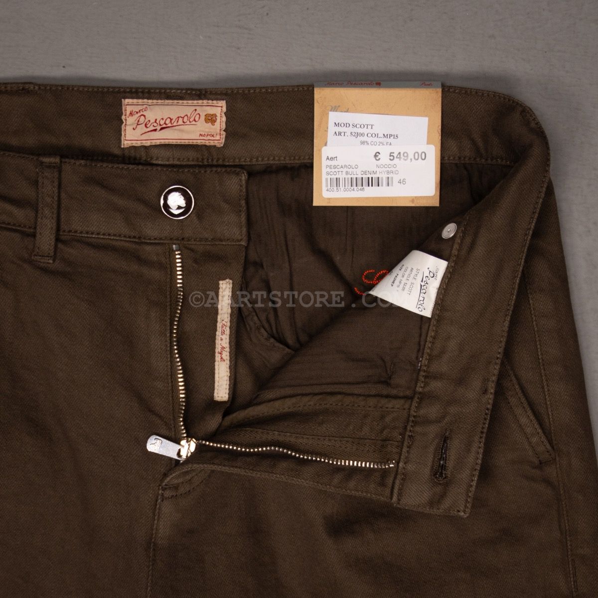 Pescarolo is een Napolitaanse broekenmaker die luxe combineert met een geheel eigen visie op hoe een broek moet zitten en vallen. Een prachtig bedrijf van twee jonge mannen die in staat zijn kunsten en stijlen van voorbije generaties te vertalen naar het nu. De Scott is weer (ze verzinnen graag wat nieuws) een nieuw model uit Napels. Het is een kruising van een chino en een jeans, of eigenlijk is het een chino met denim details en in een licht denim materiaal. De Scott heeft een iets wijdere pasvorm op het bovenbeen en één bandplooi. Dat geeft de Scott een hip en eigentijds silhouet dat zowel past bij een jasje maar ook prima gedragen kan worden onder een cashmere trui of T-shirt en een kort jack.