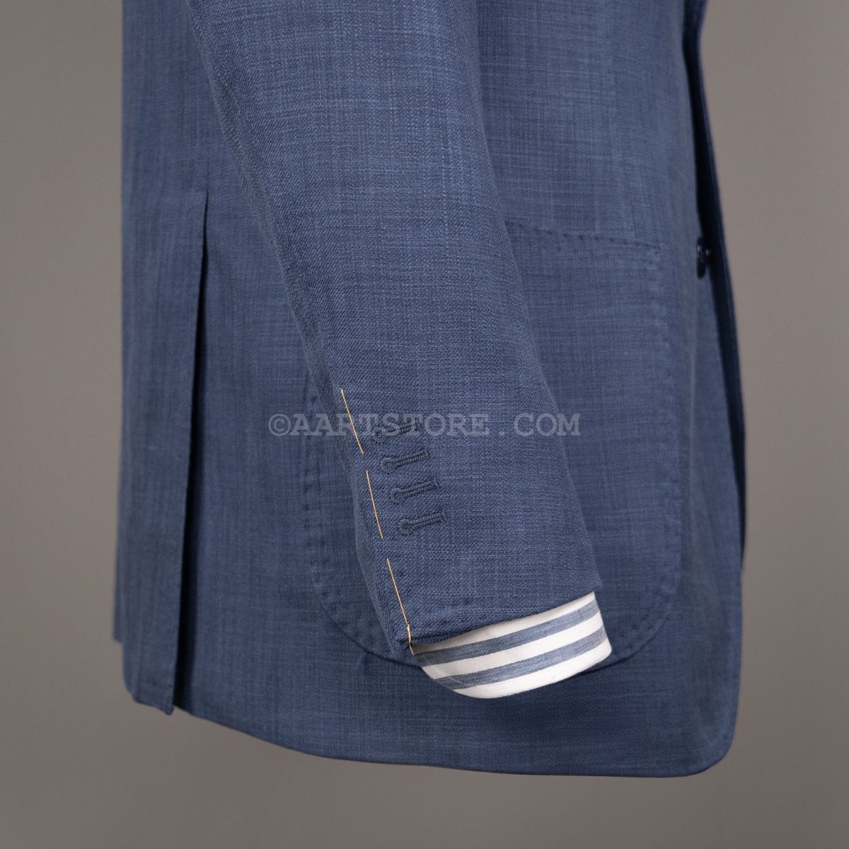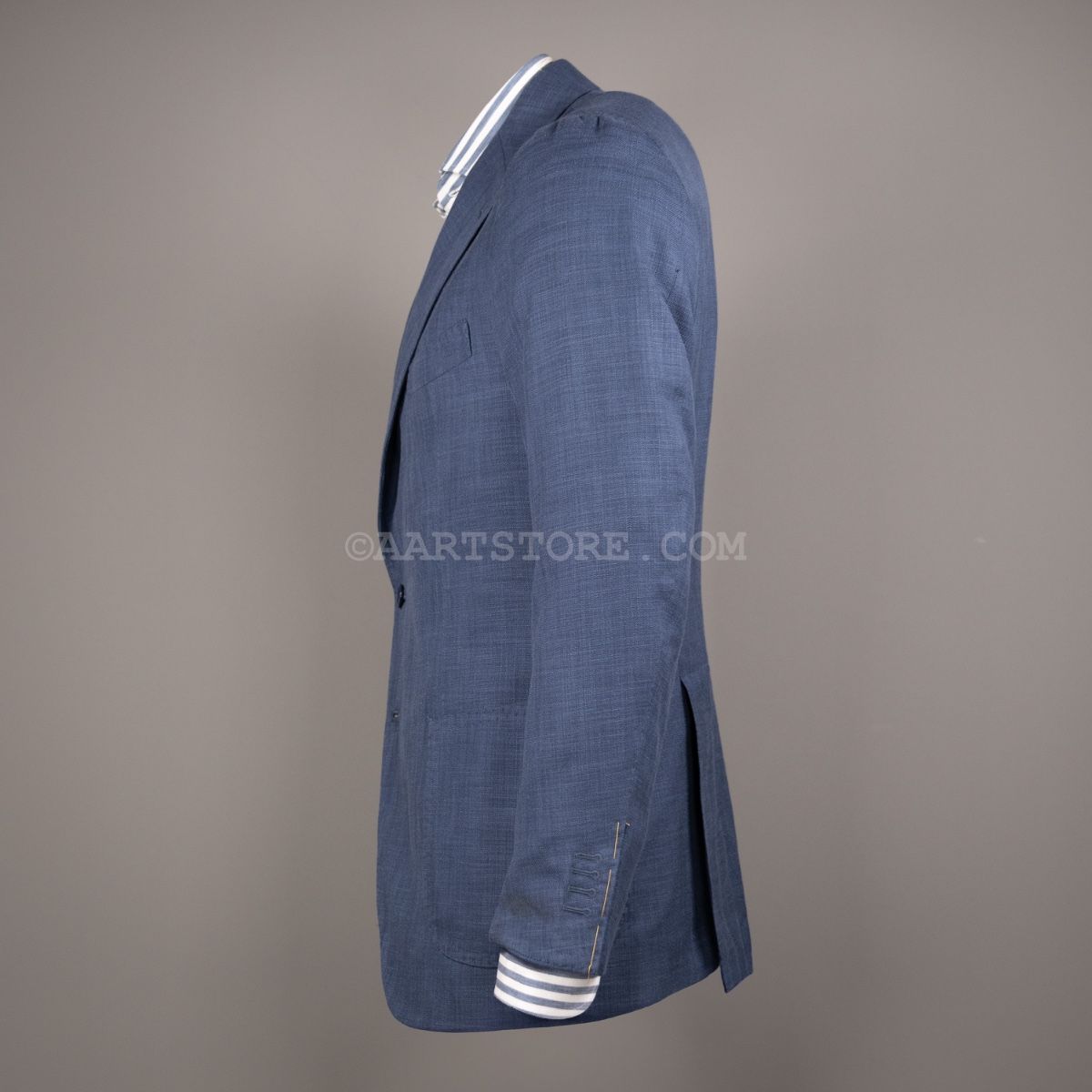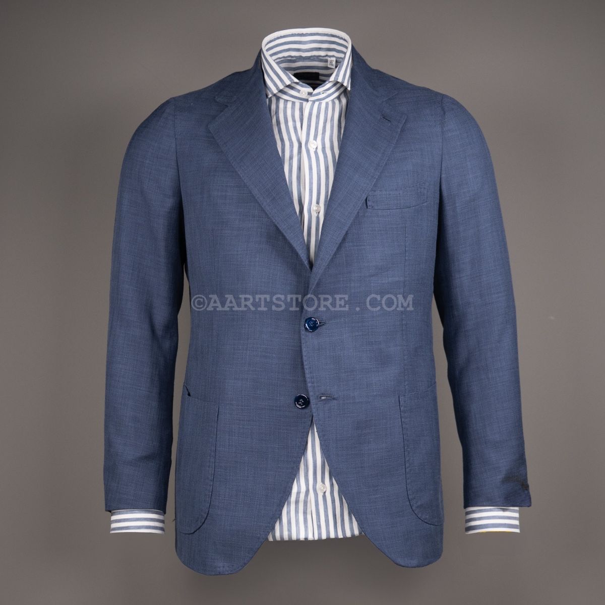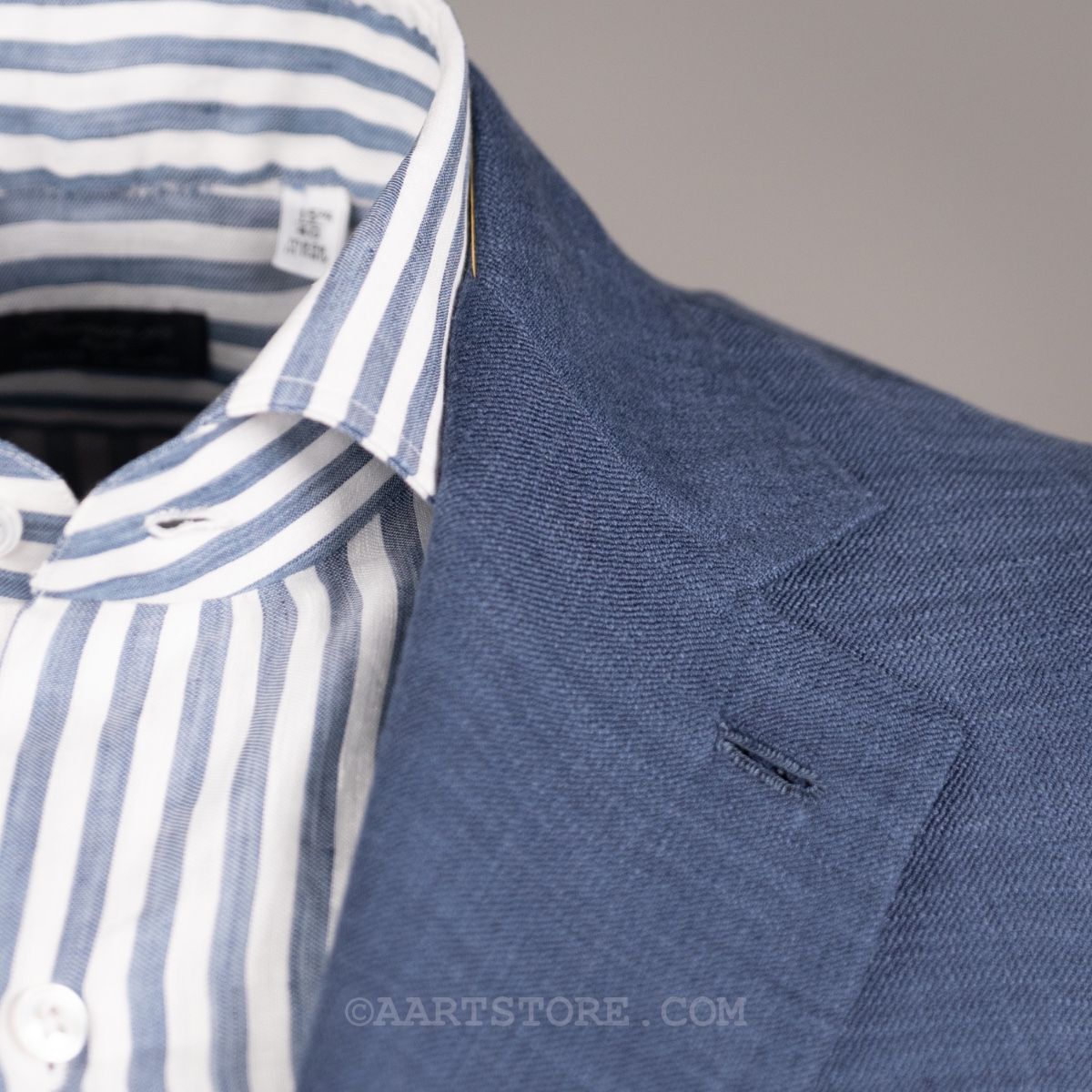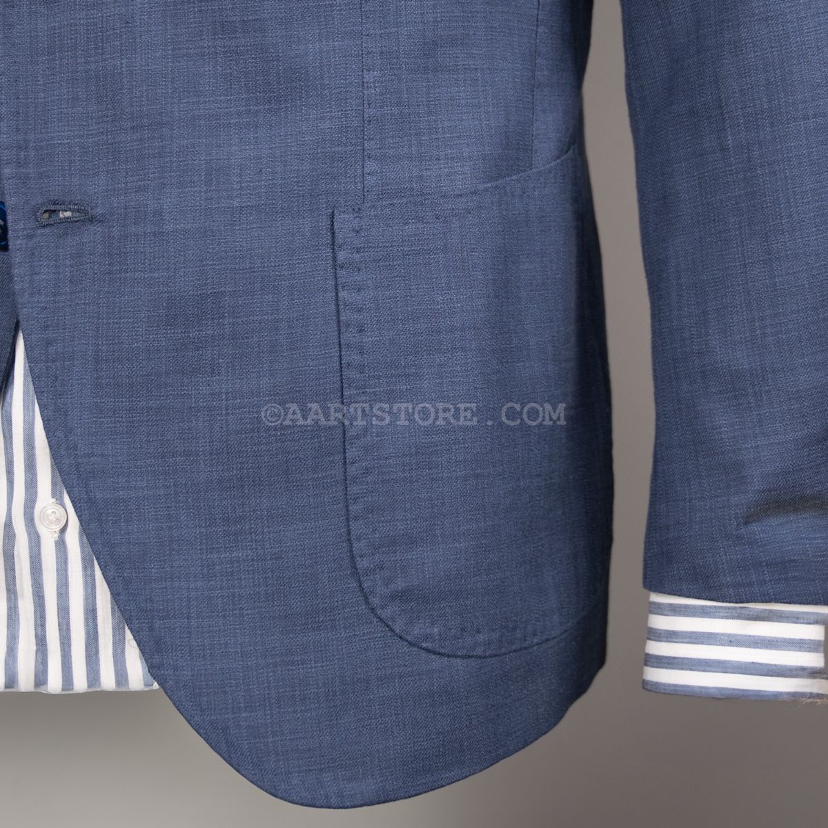 Gabo is een Napolitaanse kleermakerij die traditie combineert met een bijna uitgestorven smaak in stoffen en materialen. Het zijn handgemaakte jasjes die een elegante en comfortabele pasvorm combineren met een sexy silhouet. Dit jasje is gesneden uit Softime, een stof van Loro Piana in een combinatie van katoen en zijde. De zichtbare structuur geeft het jasje een iets sportieve uitstraling, maar het is wel echt te dragen voor business. De stof is licht en luchtig, aangenaam op een zomerse avond. Zoals vaak bij Loro Piana heeft de stof een verfijnde val. Perfect te combineren met een lichte chino of juist een donkere denim.