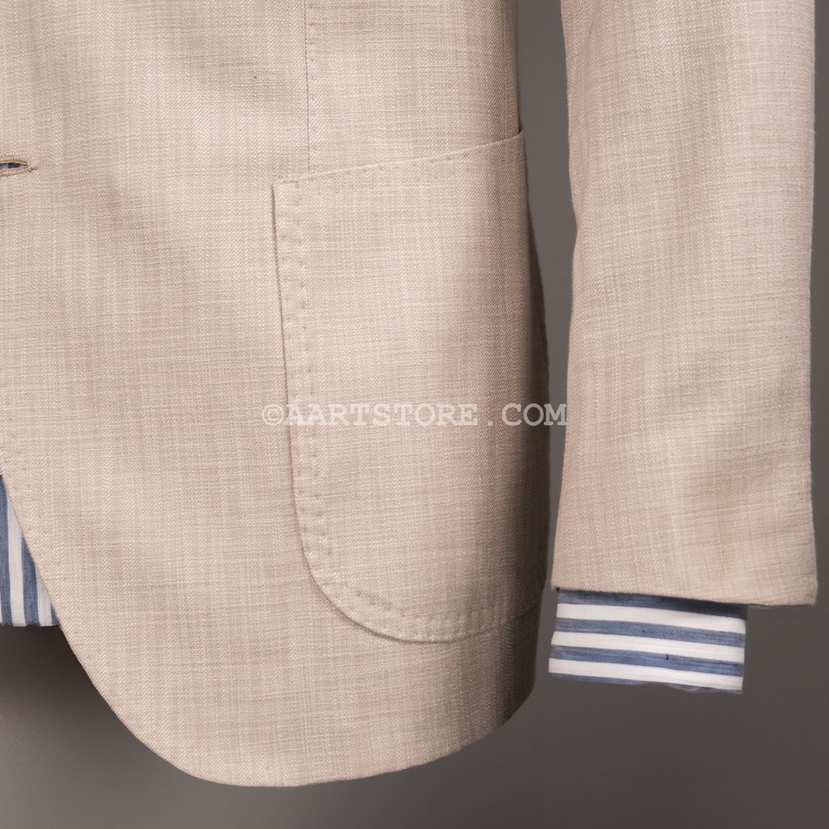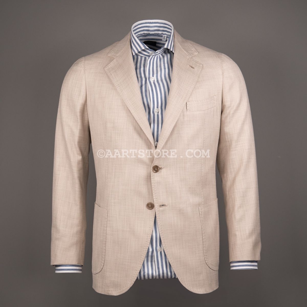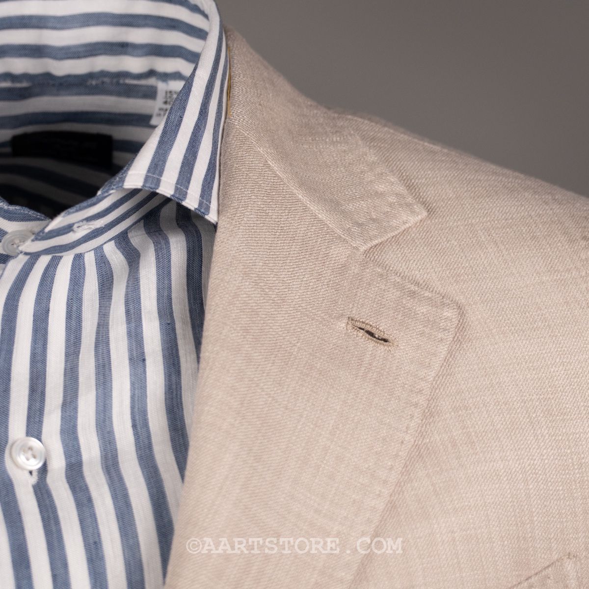 Gabo is een Napolitaanse kleermakerij die traditie combineert met een bijna uitgestorven smaak in stoffen en materialen. Het zijn handgemaakte jasjes die een elegante en comfortabele pasvorm combineren met een sexy silhouet. Dit jasje is gesneden uit Softime, een stof van Loro Piana in een combinatie van katoen en zijde. De zichtbare structuur geeft het jasje een iets sportieve uitstraling, maar het is wel echt te dragen voor business. De stof is licht en luchtig, aangenaam op een zomerse avond. Zoals vaak bij Loro Piana heeft de stof een verfijnde val. Perfect te combineren met een lichte chino of juist een donkere denim.