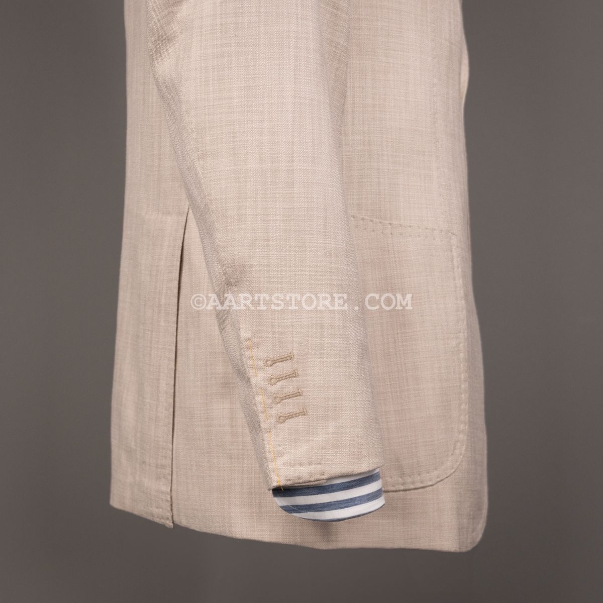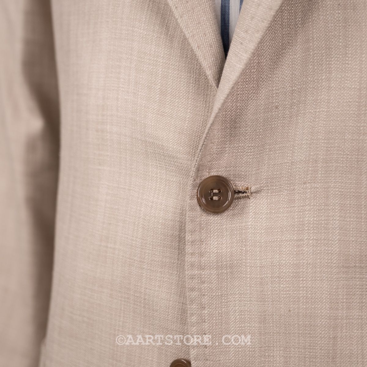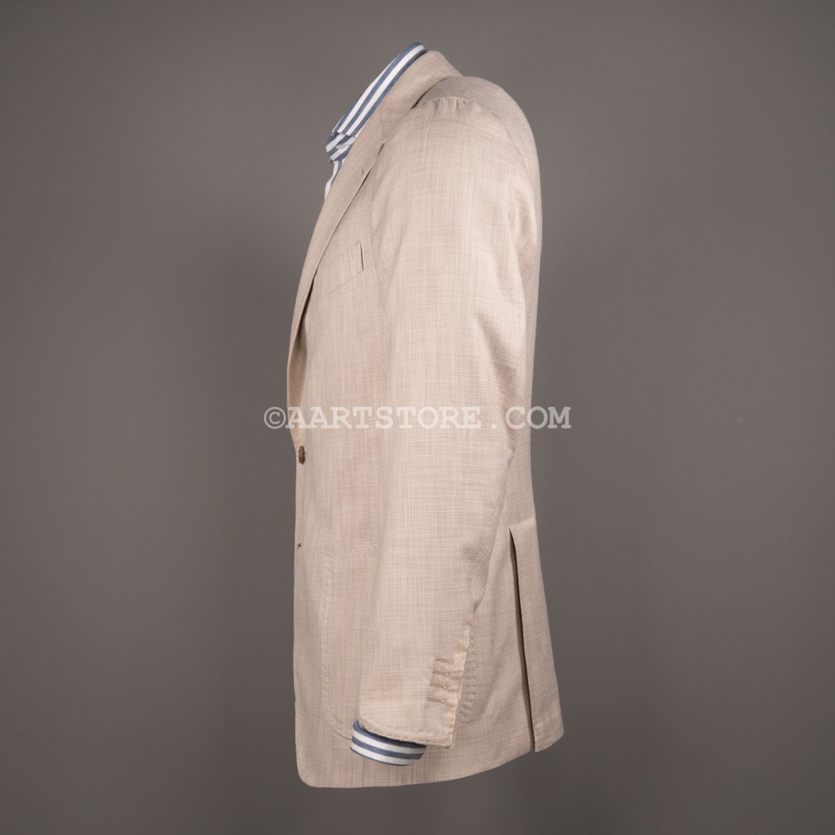 Gabo is een Napolitaanse kleermakerij die traditie combineert met een bijna uitgestorven smaak in stoffen en materialen. Het zijn handgemaakte jasjes die een elegante en comfortabele pasvorm combineren met een sexy silhouet. Dit jasje is gesneden uit Softime, een stof van Loro Piana in een combinatie van katoen en zijde. De zichtbare structuur geeft het jasje een iets sportieve uitstraling, maar het is wel echt te dragen voor business. De stof is licht en luchtig, aangenaam op een zomerse avond. Zoals vaak bij Loro Piana heeft de stof een verfijnde val. Perfect te combineren met een lichte chino of juist een donkere denim.