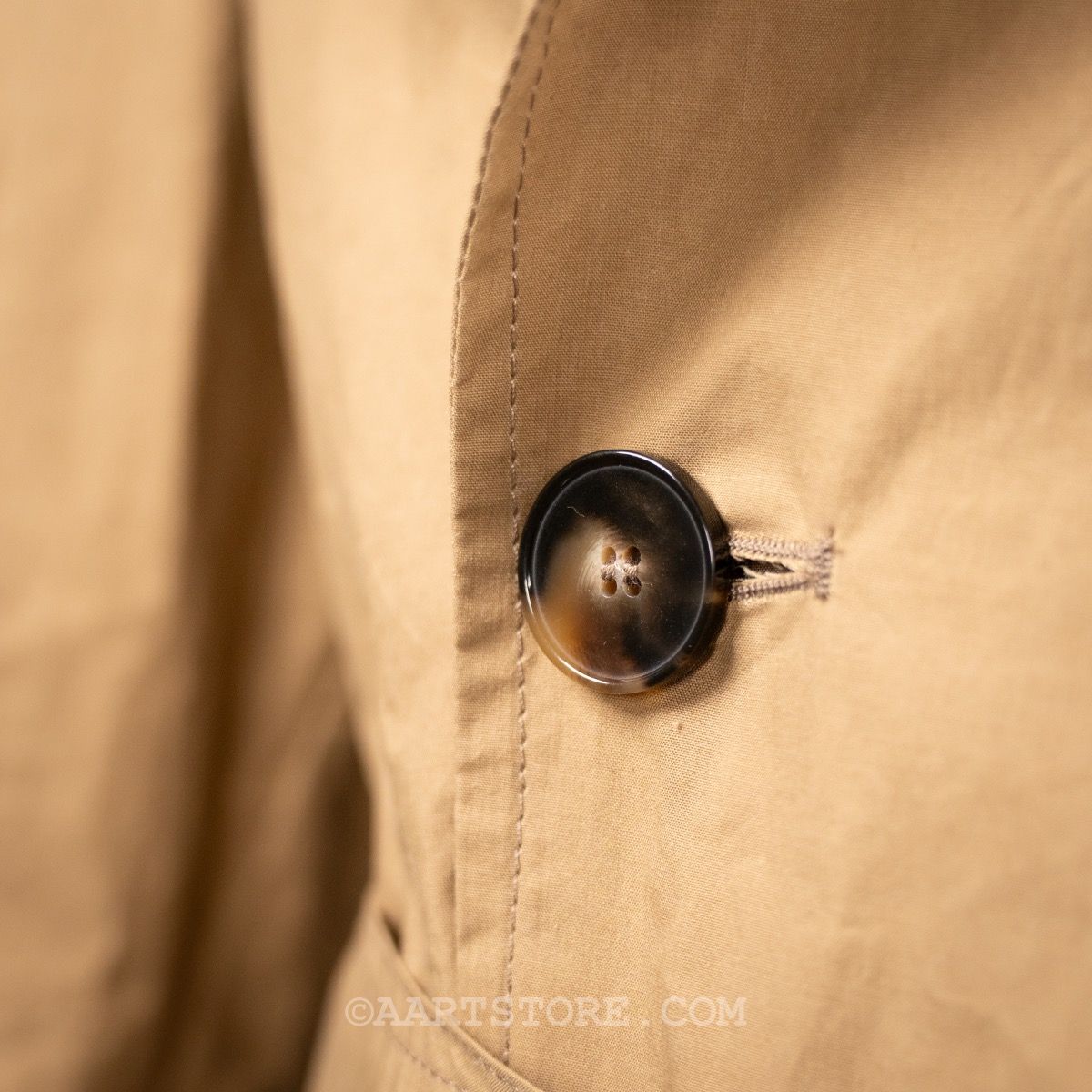 L’impermeabile is een van onze nieuwste merken maar tegelijkertijd is het ook een van de oudste merken in ons arsenaal. Het stamt uit de jaren na de eerste wereldoorlog als Italiaans antwoord op de toen mateloos populaire regenjassen van Britse merken als Aquascutum en Burberry. Daarna is het merk wat in vergetelheid geraakt totdat de huidige eigenaar het ‘vond’ in de nalatenschap van zijn vader… Deze Vasco trench is een zomerse en eigentijdse versie van de klassieke trenchcoat. Door het gebruik van een licht gewaxt (het is niet vet) materiaal en de ongevoerde constructie is dit een zwierige en licht casual zomerjas.